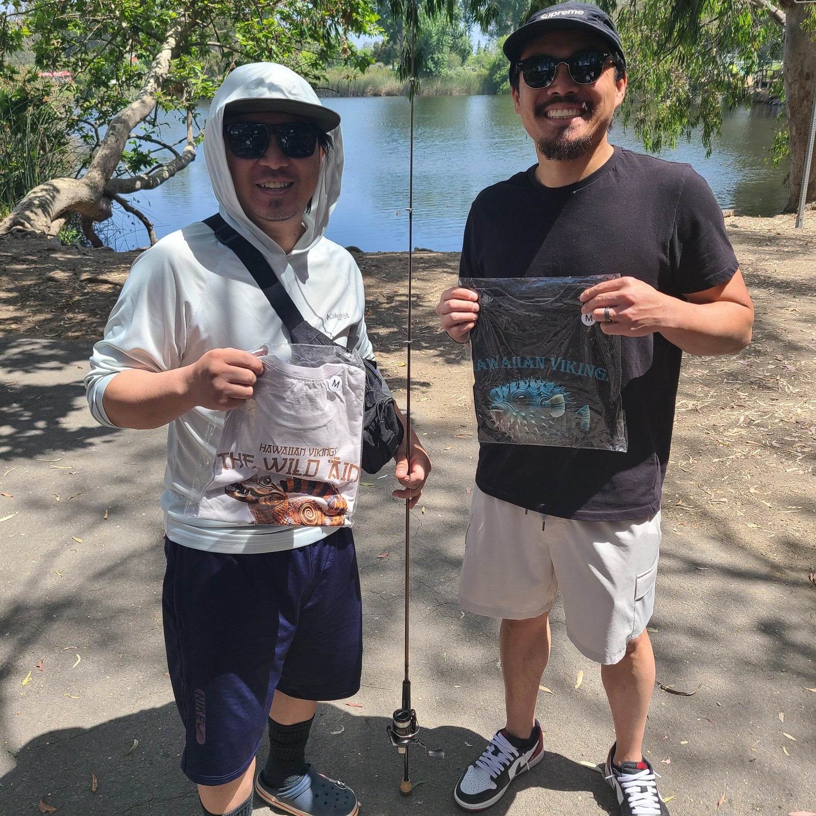 At Central Park Lake in Huntington Beach, Valkyrie and Freyja shared aloha with every fisherman they met—handing out free Hawaiian Vikings shirts and making new friends along the way. Even if the fish weren’t biting, everyone walked away with a smile and a little extra sunshine in their day.