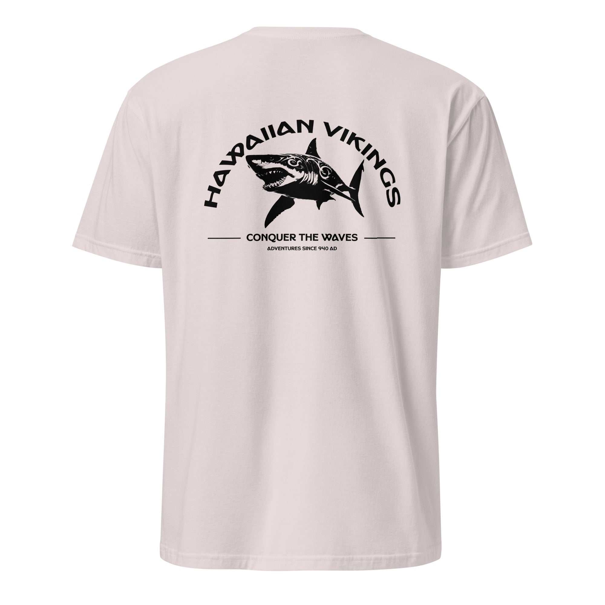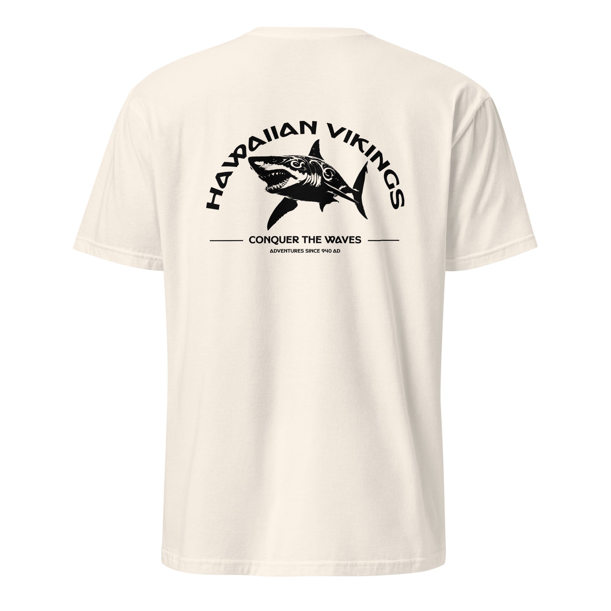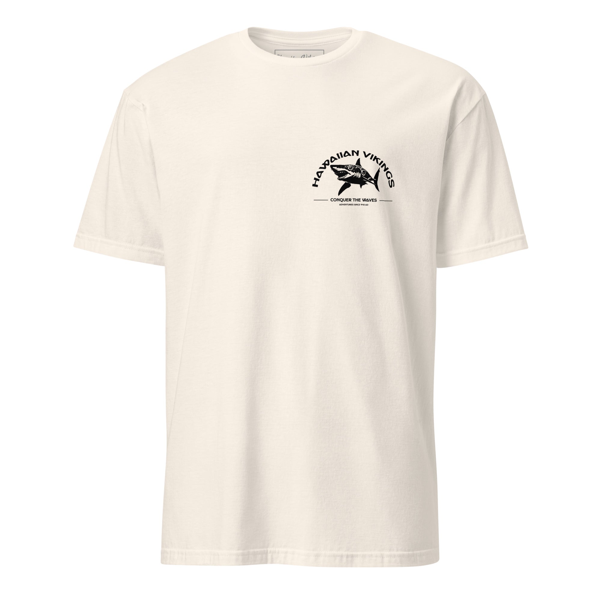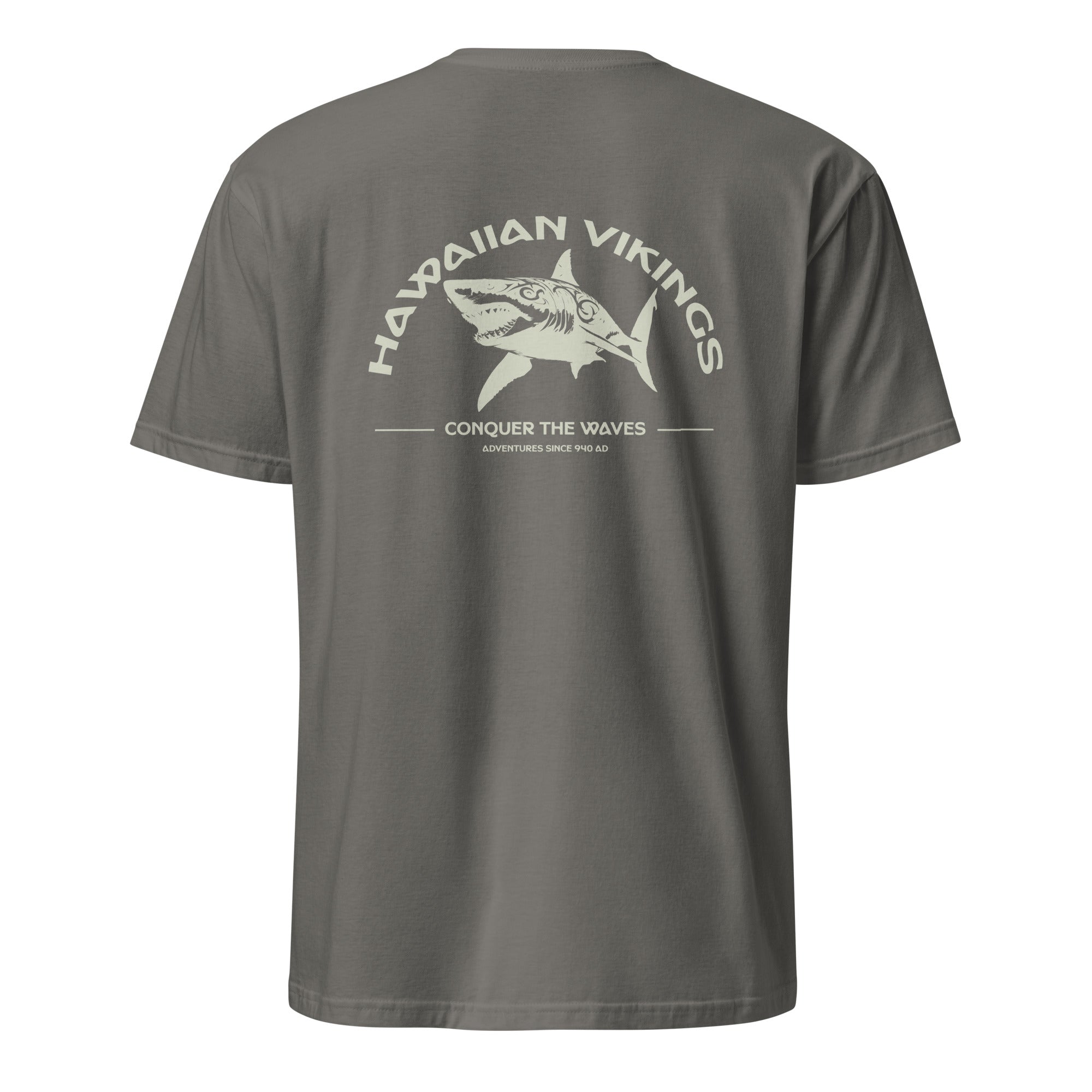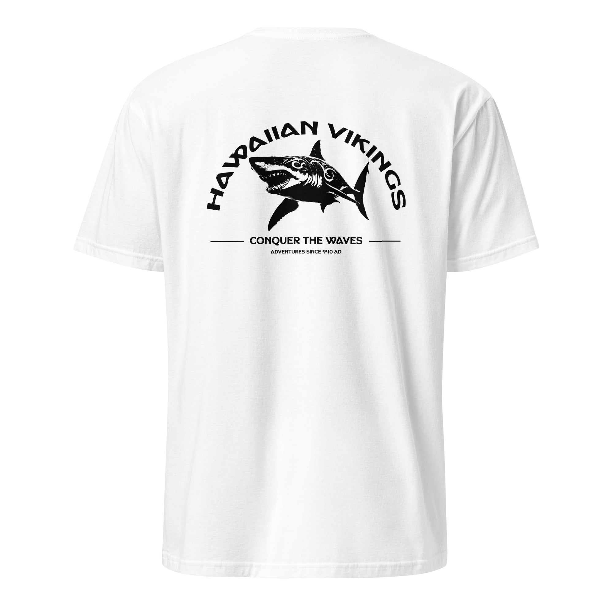Harness the power of the ocean with the Conquer the Waves tee from Hawaiian Vikings. This short-sleeve unisex t-shirt showcases a bold tribal silhouette of a great white shark, paired with the tagline “Surf Company – Conquer the Waves.” It’s a design that merges the raw force of the sea’s most legendary predator with the fearless spirit of surf culture.