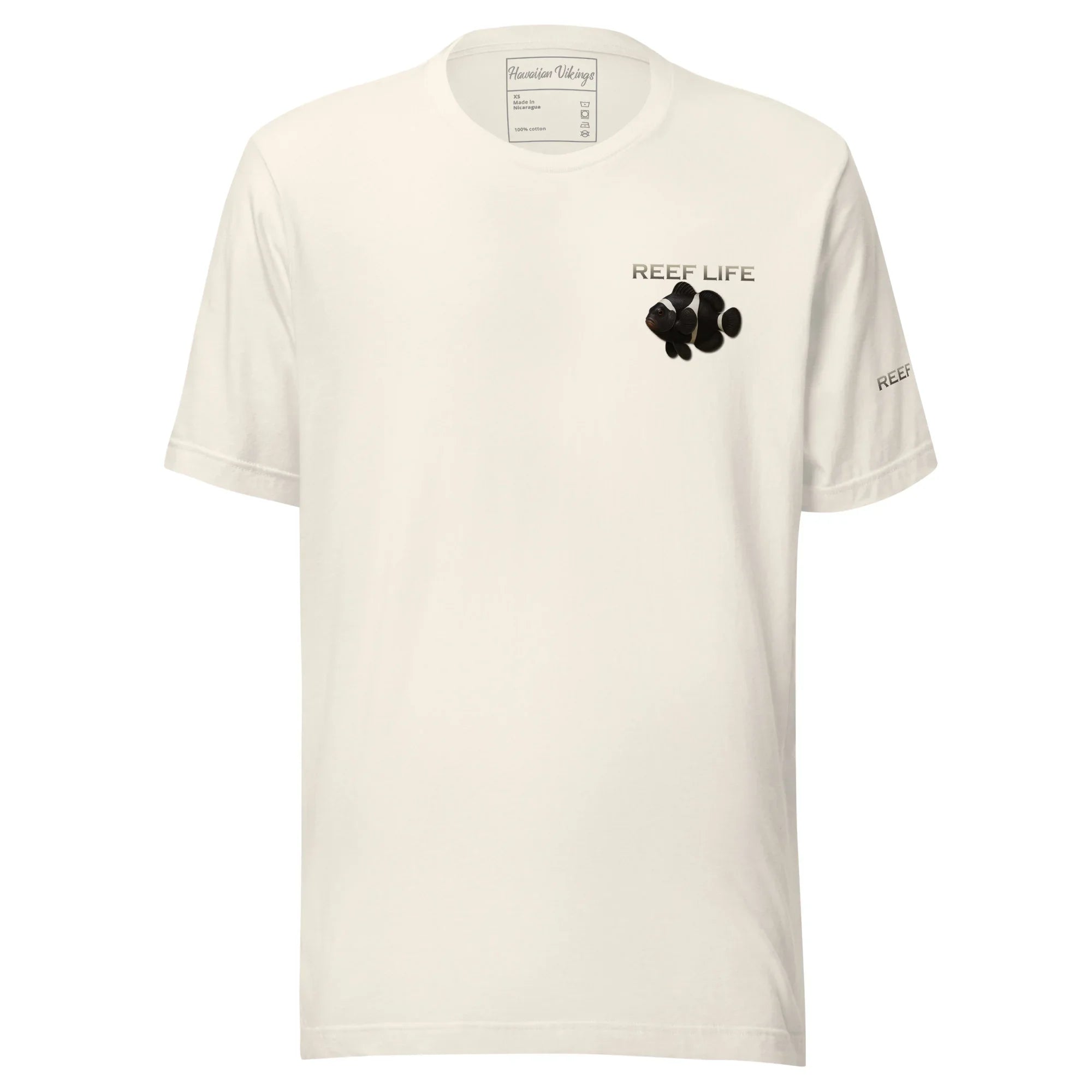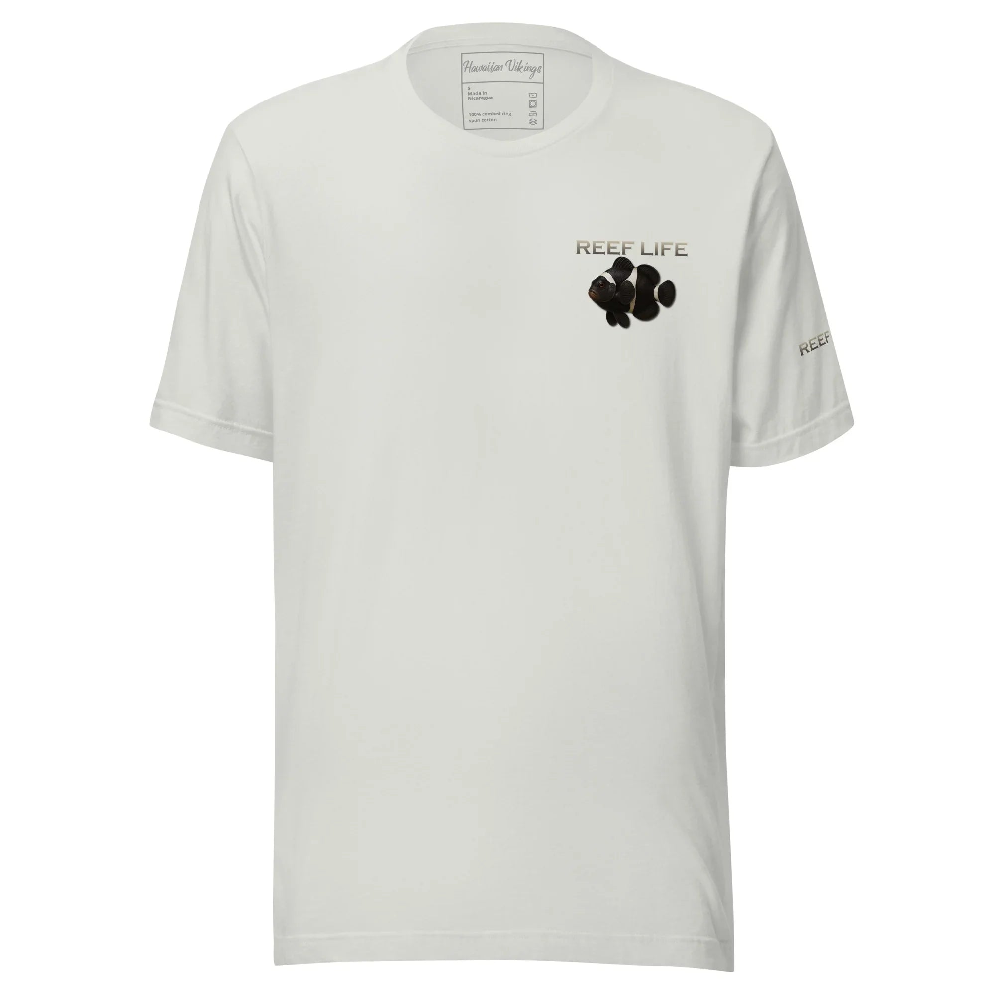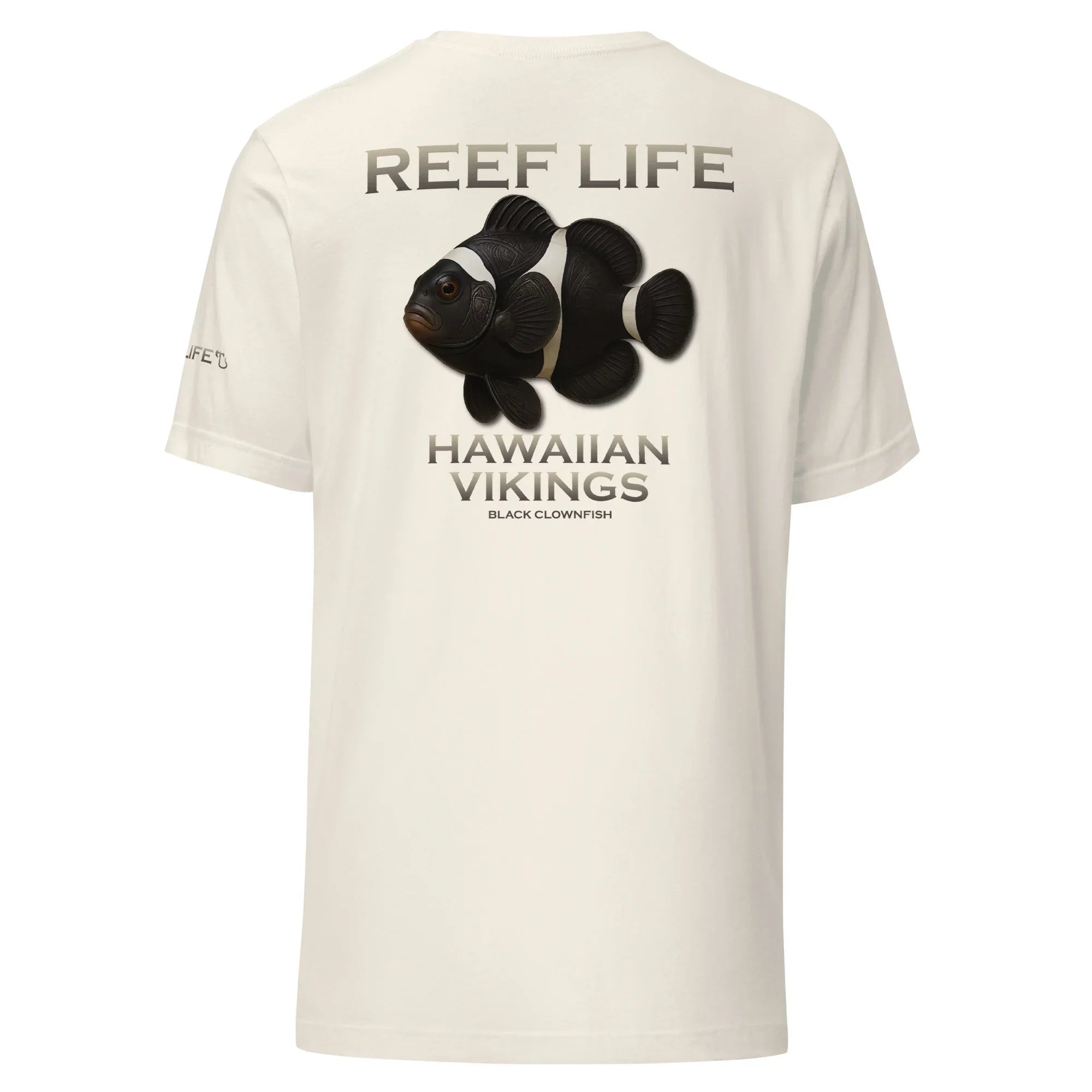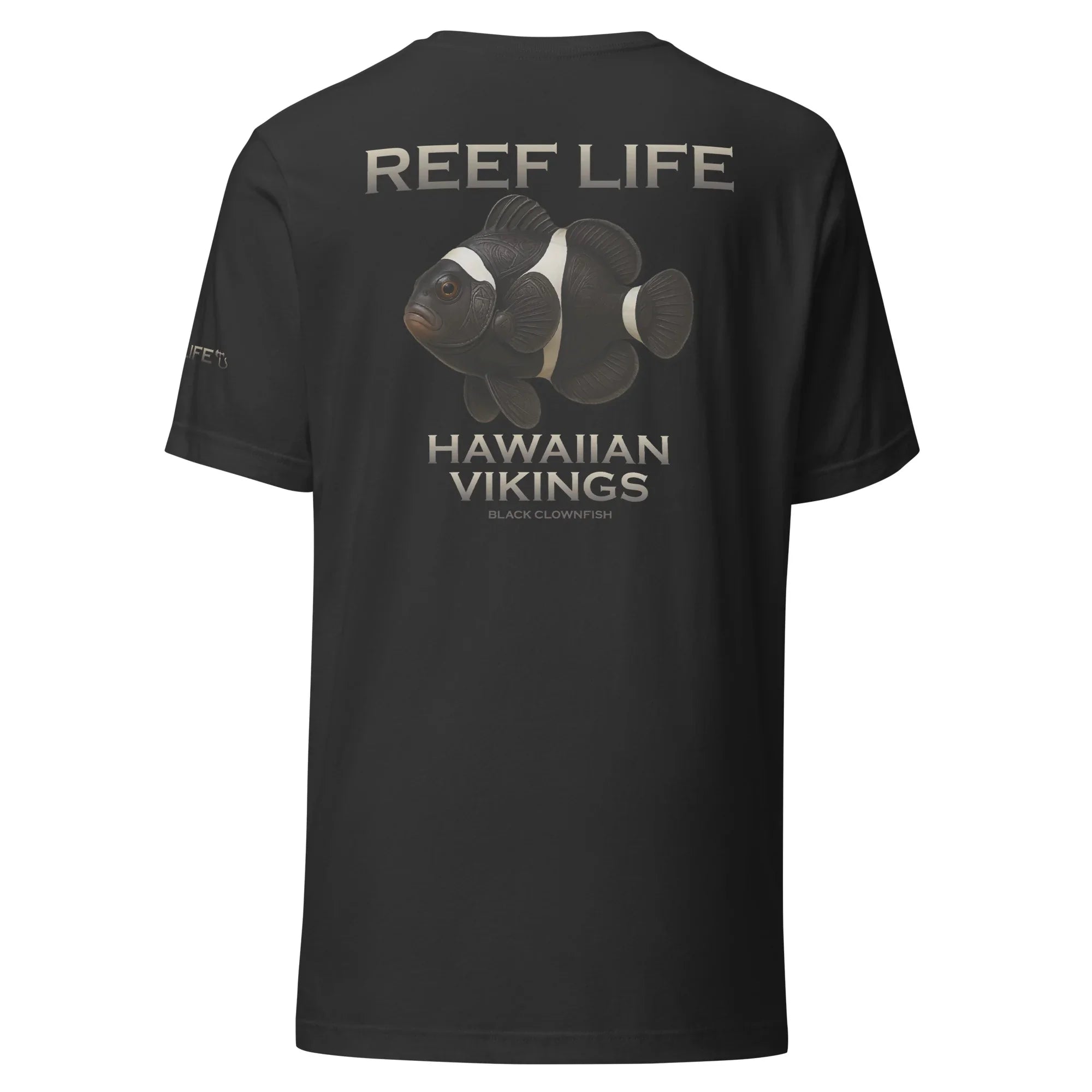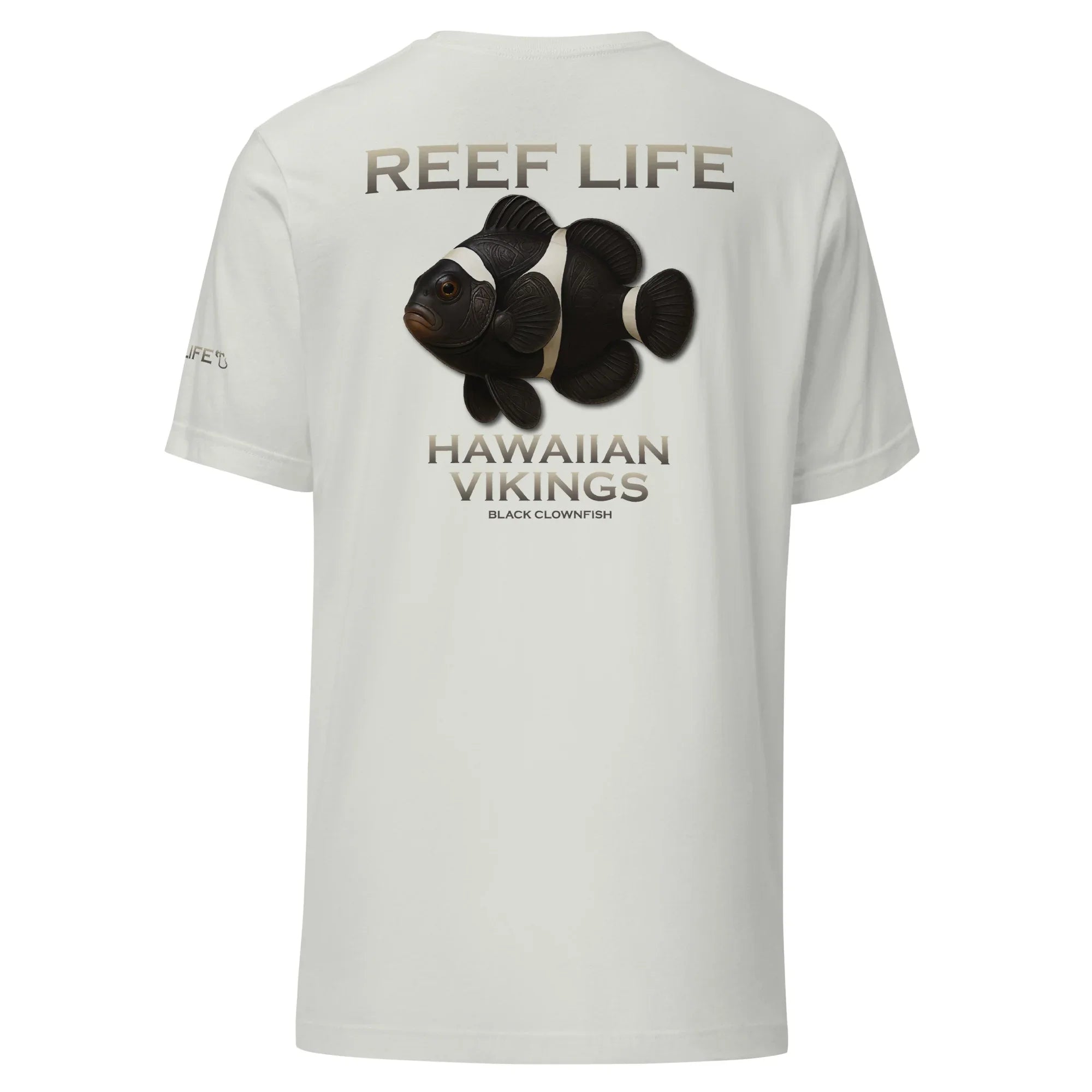 Dark, resilient, and quietly commanding, this standout tee from the Reef Life Collection features the Black Clownfish, known for its deep coloration and powerful reef presence. The design emphasizes its bold contrast while seamlessly integrating engraved Hawaiian motifs and Viking-inspired carvings into its natural form.
