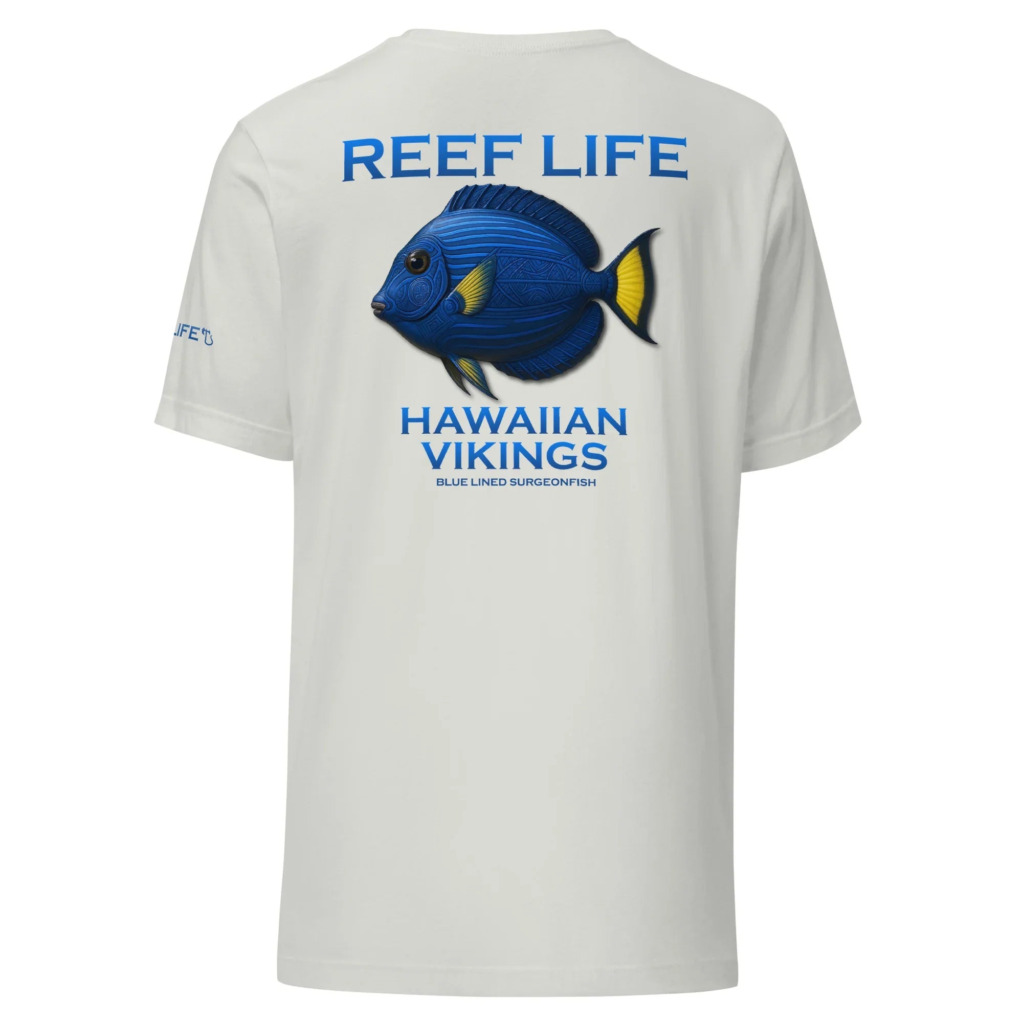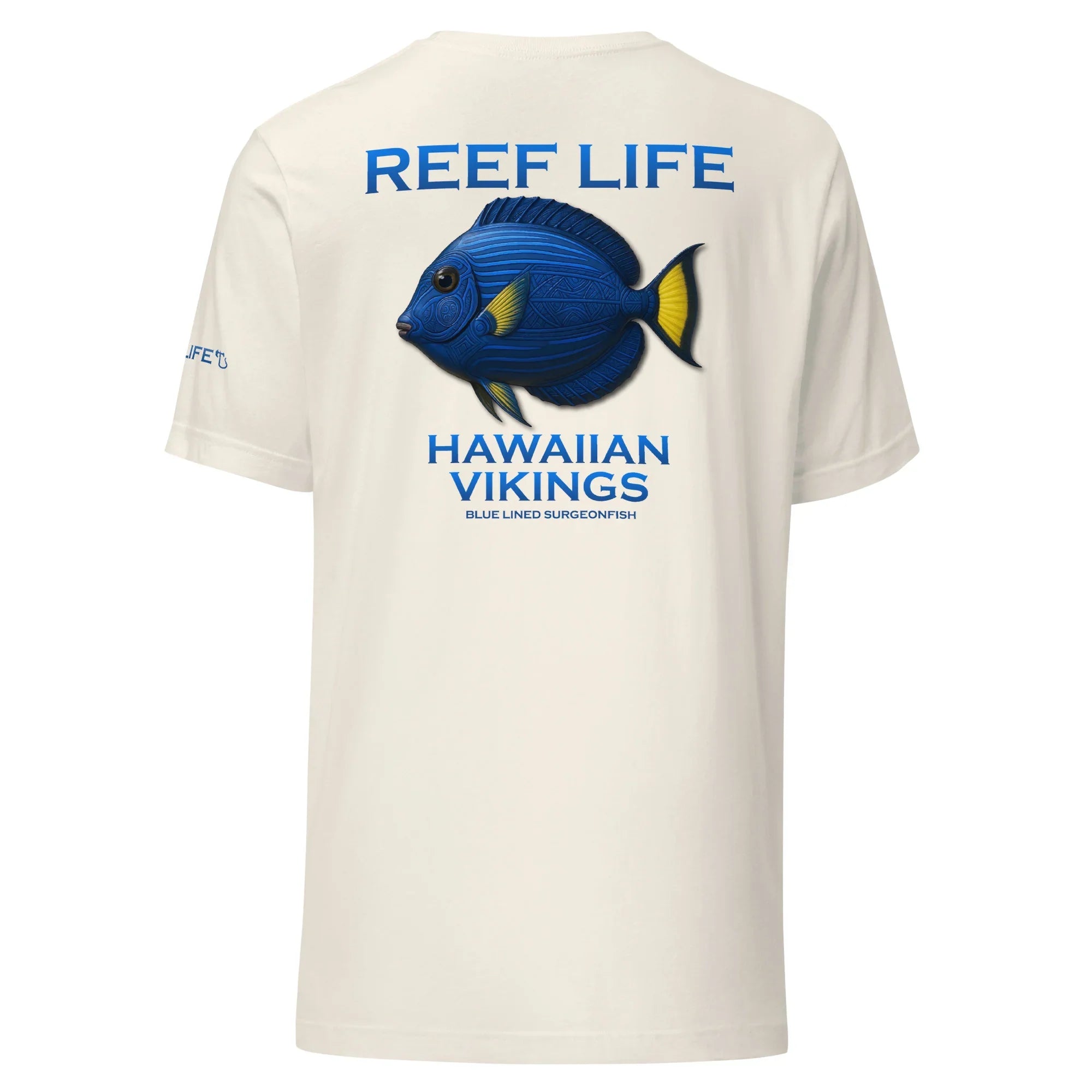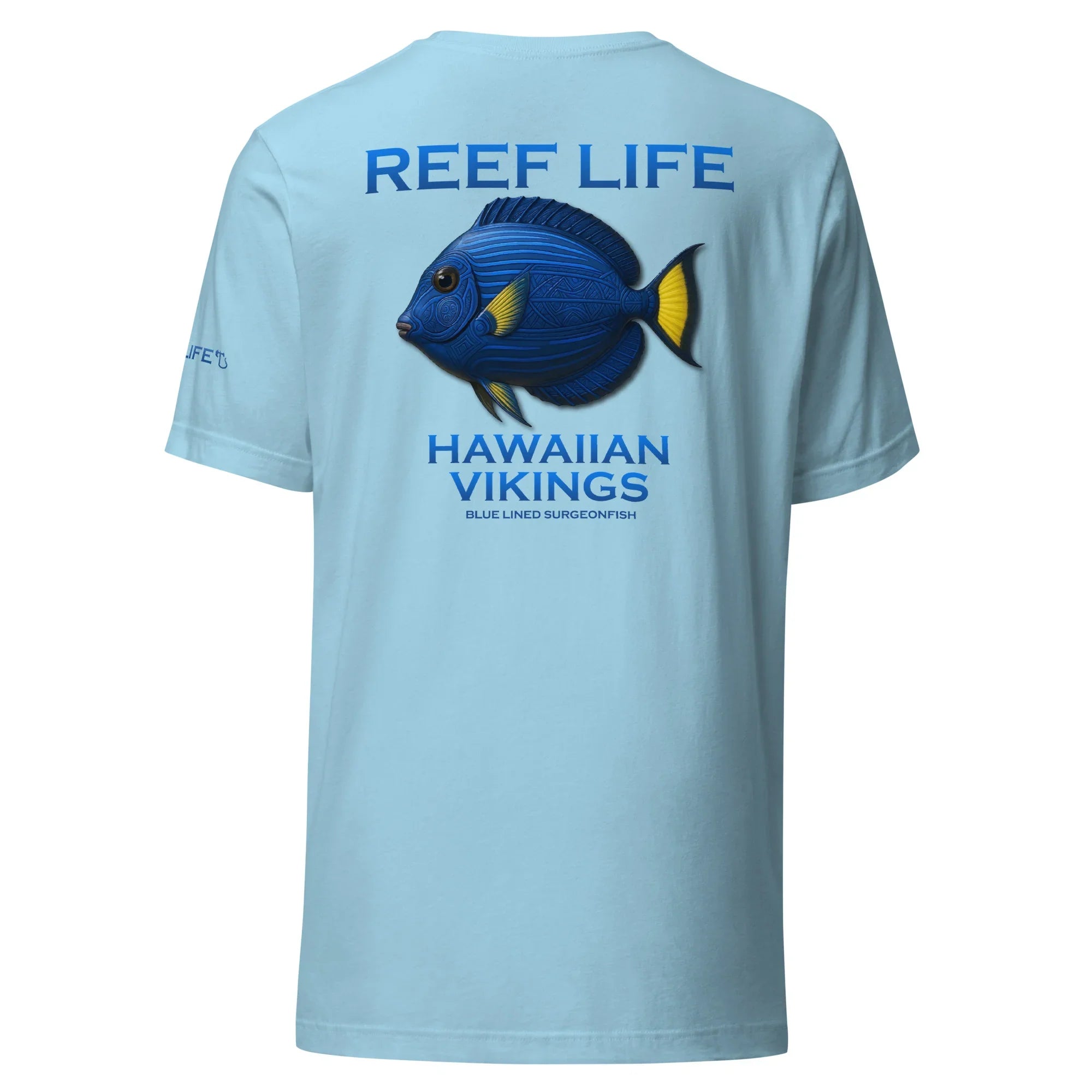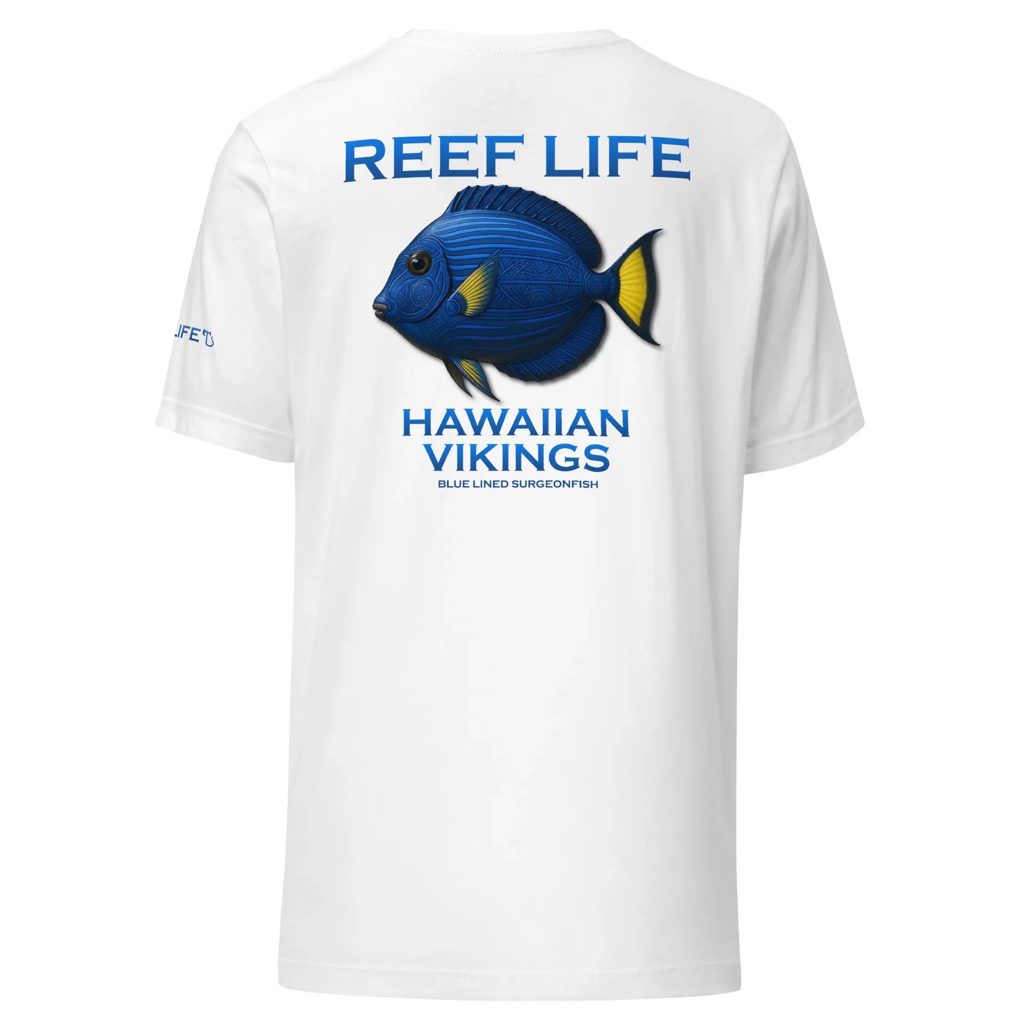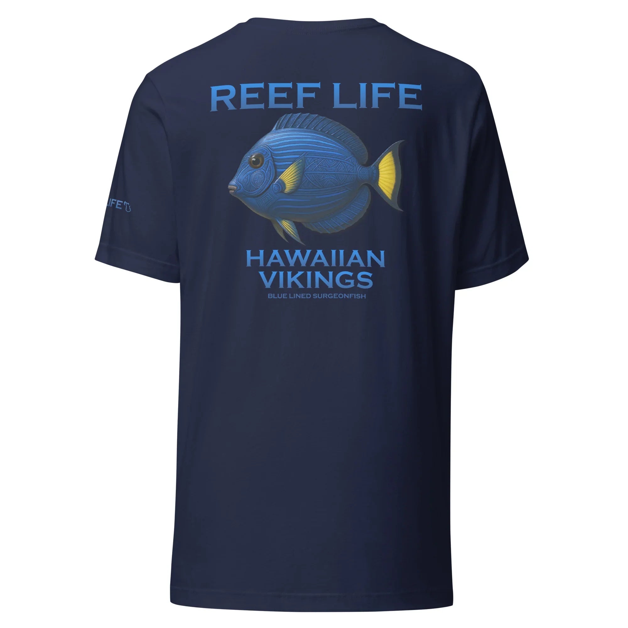 This Reef Life design captures the surgeonfish’s deep ocean blues and vivid yellow accents, enhanced with subtle Hawaiian-inspired linework and Viking-style engraving patterns seamlessly carved into its natural form. The detailing honors both island heritage and warrior craftsmanship without overpowering the fish’s authentic coloration.