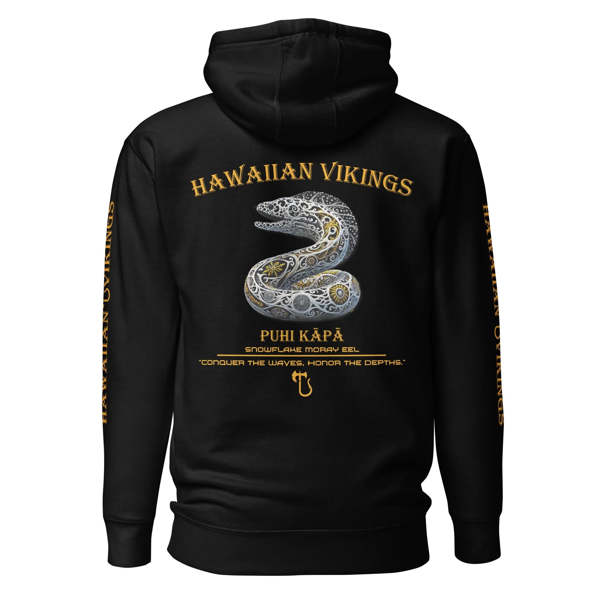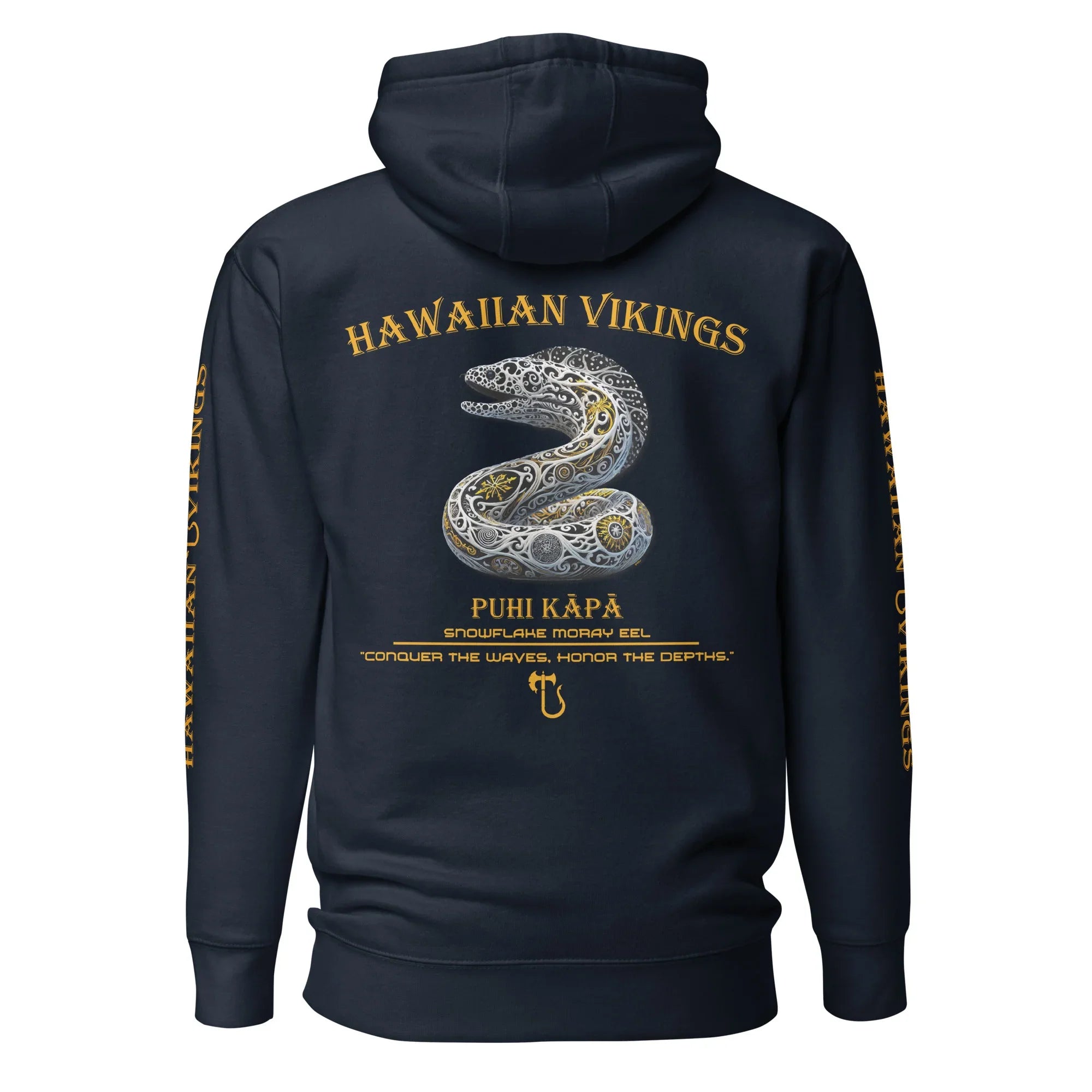 Command the reef from the shadows with the Snowflake Moray Eel Hoodie from the Legends of the Deep collection. Recognized by its bold white patterning and powerful jaws, the snowflake moray rules its territory through patience and crushing force rather than speed. Coiled within coral caves and rock crevices, it waits with calm confidence before striking when the moment is right. A symbol of control, awareness, and strength without panic, it represents dominance through precision.