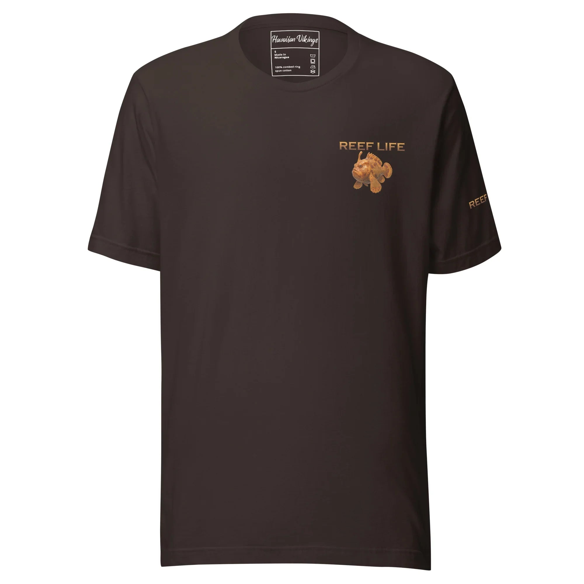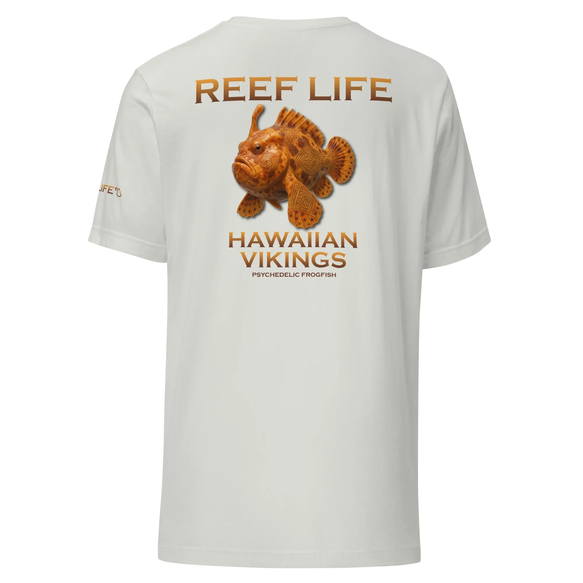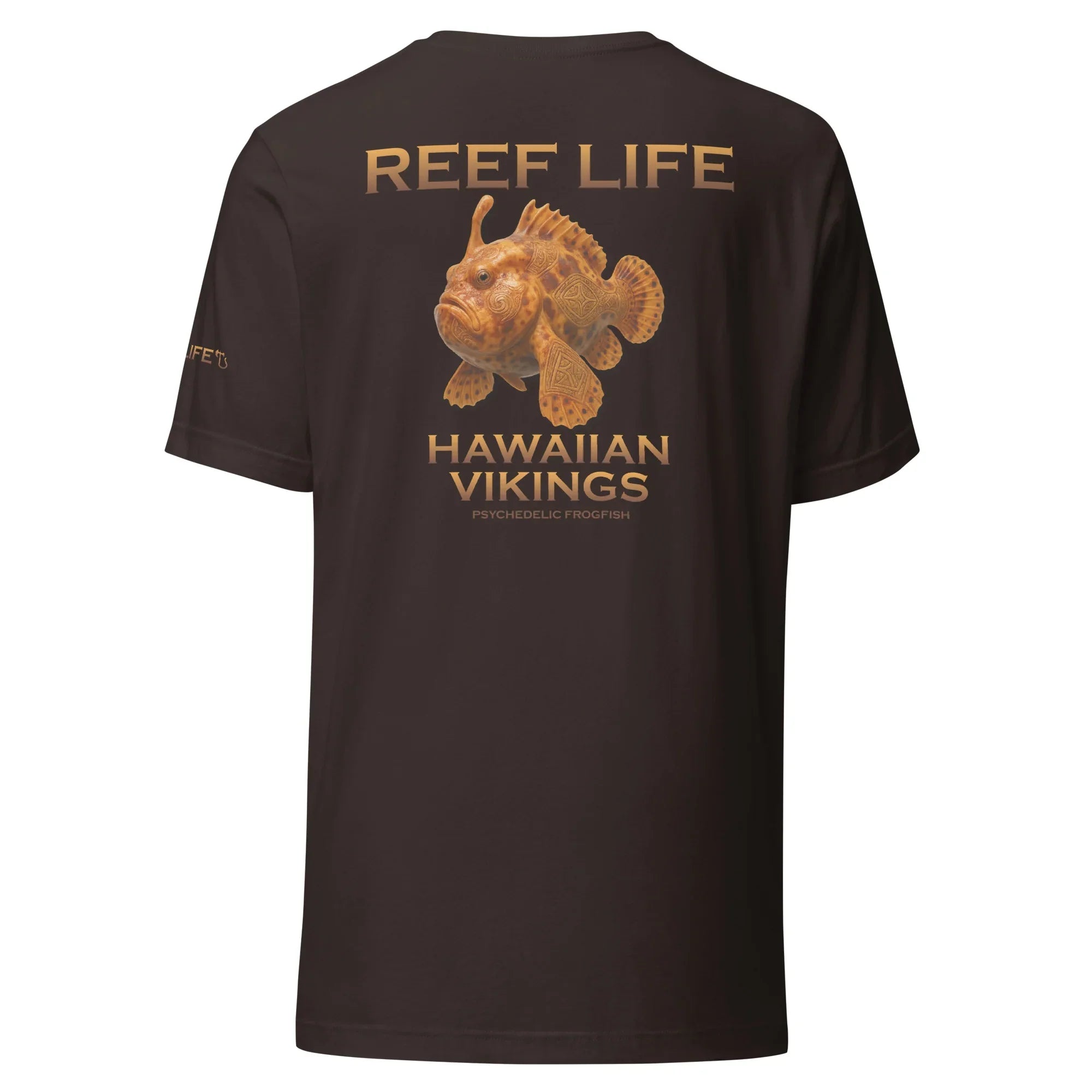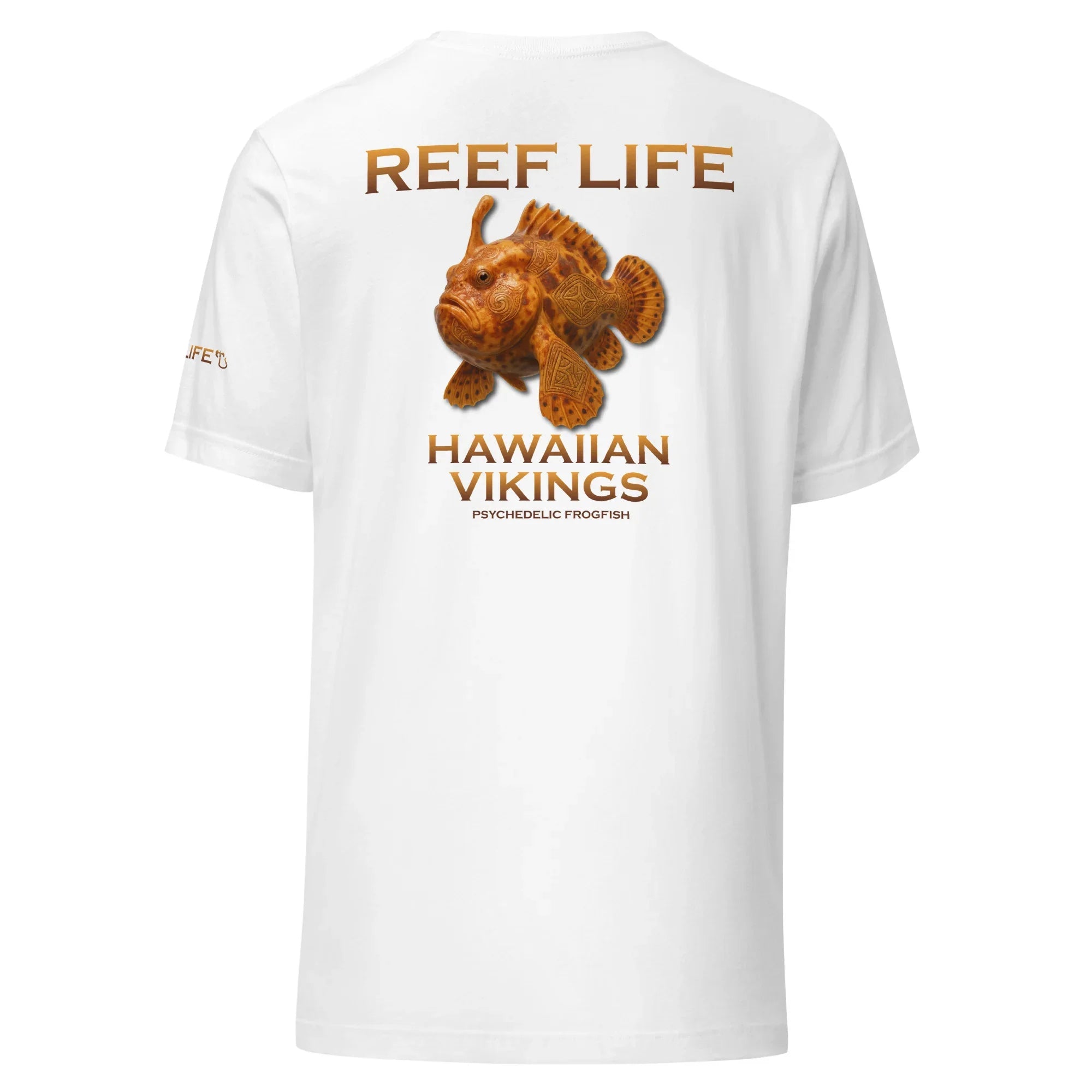 This Reef Life design captures the frogfish’s rich amber and burnt-orange tones, layered with subtle Hawaiian-inspired linework and Viking-style carvings fused directly into its form. The etched patterns echo ancient markings and armor engravings, enhancing the frogfish’s otherworldly appearance while honoring its natural, rugged texture.