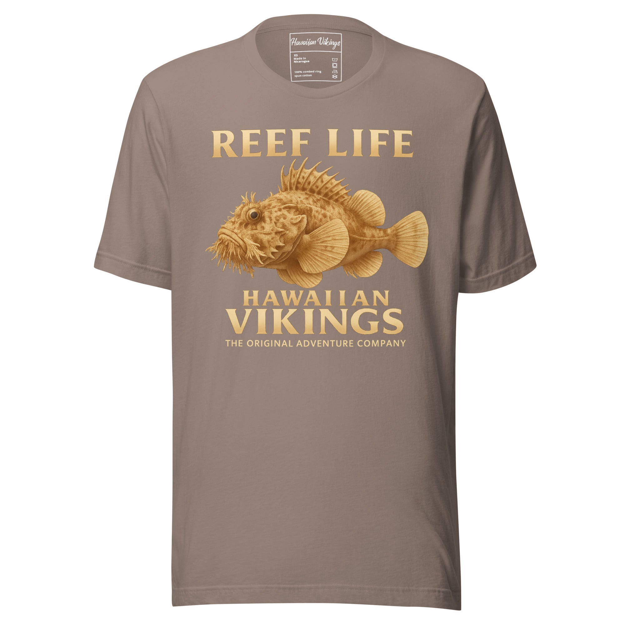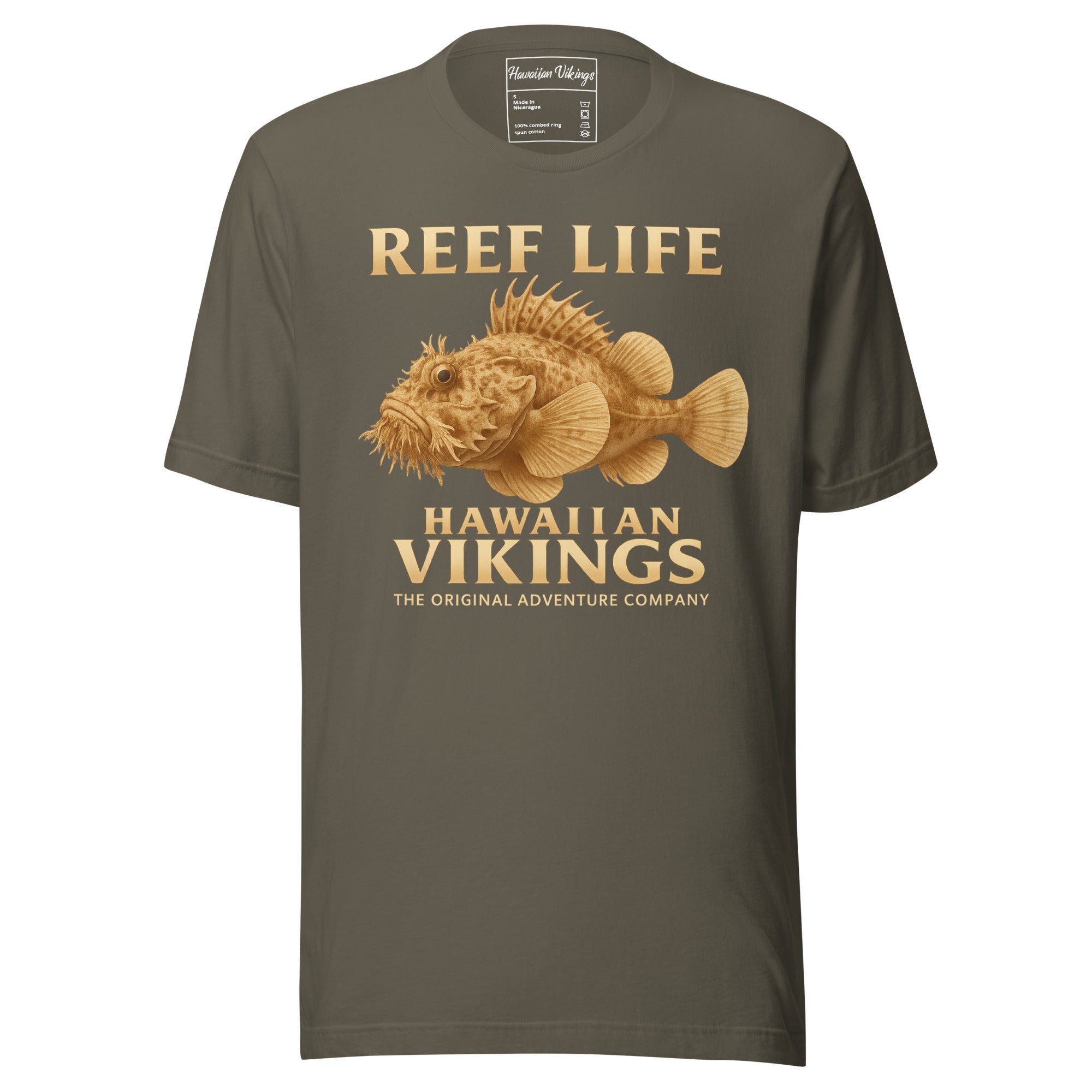 Fierce, mysterious, and masterfully camouflaged — the Bearded Scorpionfish Unisex T-Shirt from Hawaiian Vikings’ Reef Life Collection pays tribute to one of the reef’s most formidable hunters. With its rugged texture, bold fins, and stealthy colors, the Bearded Scorpionfish embodies raw strength and quiet power — a living reminder that even the most hidden creatures play a vital role in the ocean’s balance. This design captures its wild essence — untamed, resilient, and deeply connected to the rhythms of the sea.
