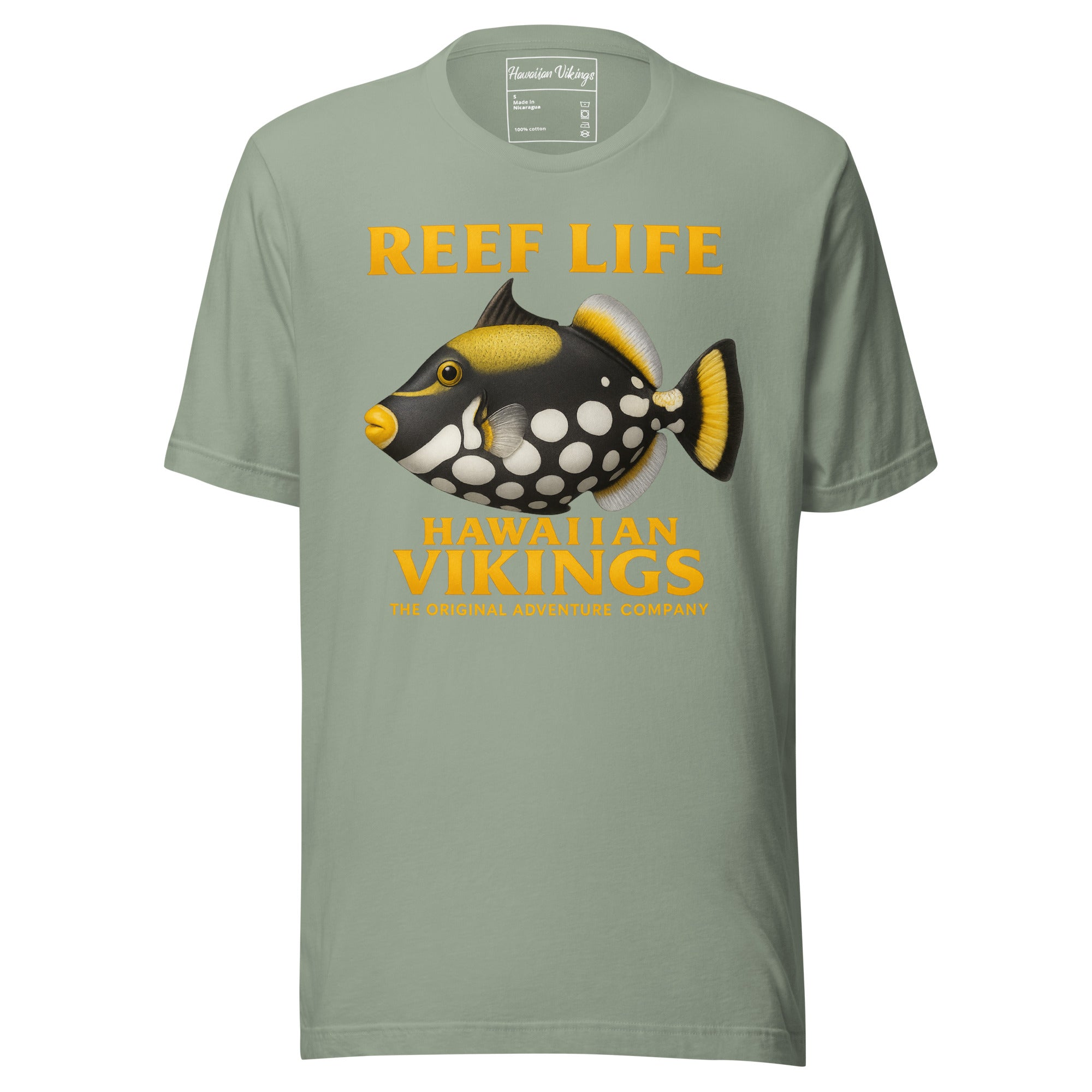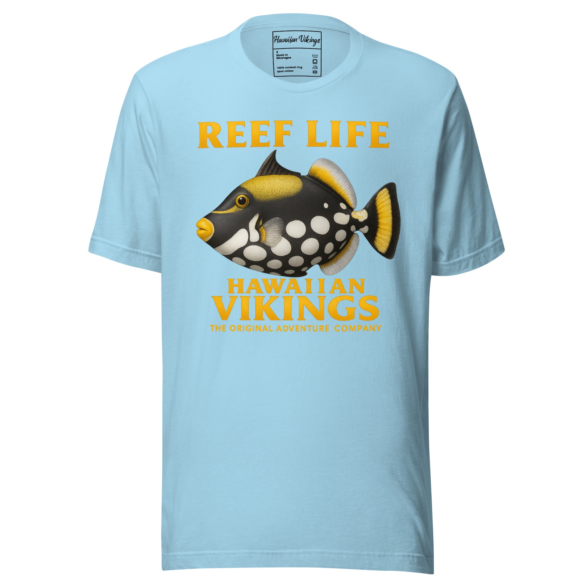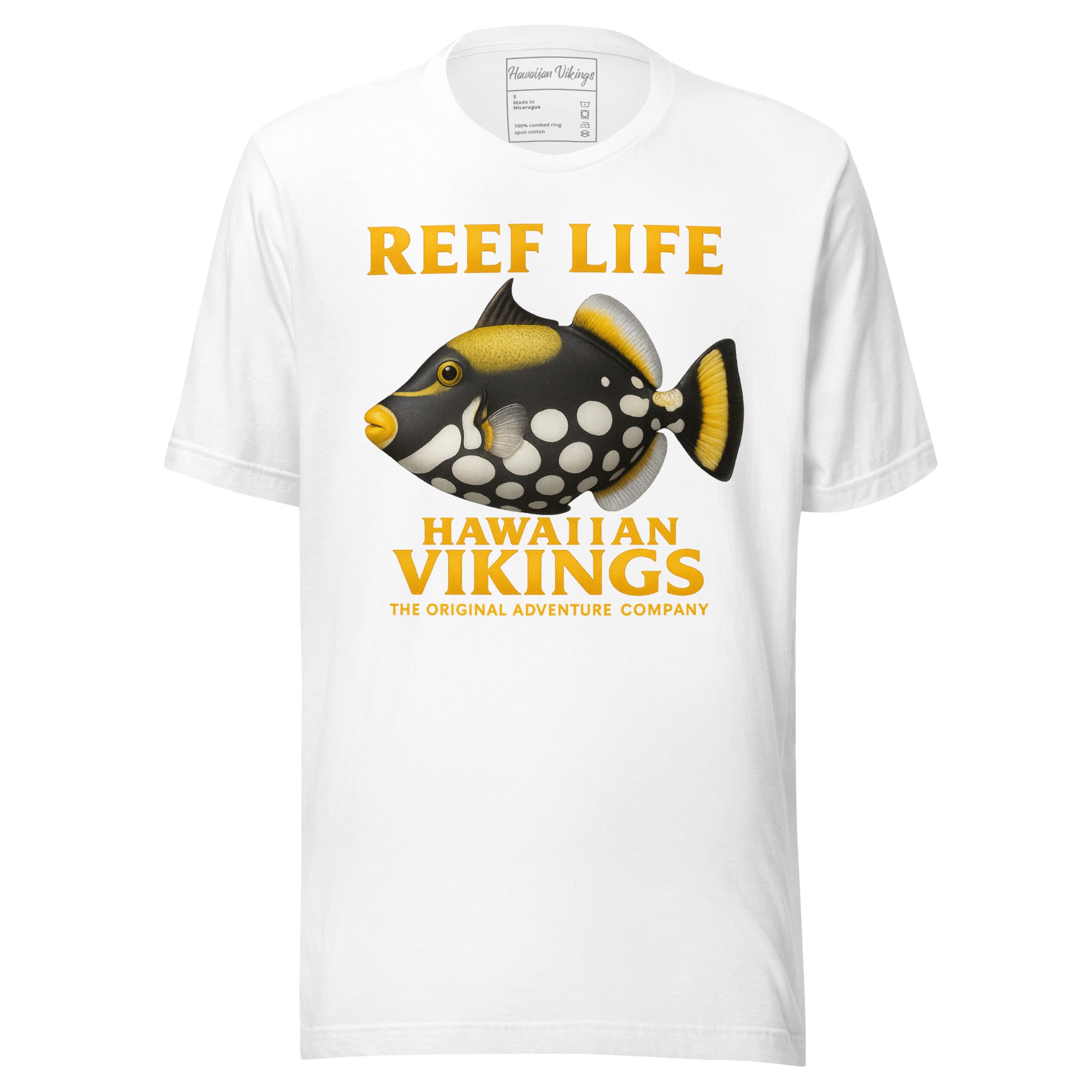 Bold, charismatic, and unforgettable — the Clown Triggerfish Unisex T-Shirt from Hawaiian Vikings’ Reef Life Collection celebrates one of the reef’s most iconic and eye-catching species. With its dramatic pattern of black, white, and gold spots paired with vivid yellow lips, the Clown Triggerfish embodies confidence, individuality, and fearless expression. A true standout among coral gardens, this reef guardian reminds us that the ocean’s strength lies in its diversity and daring beauty.