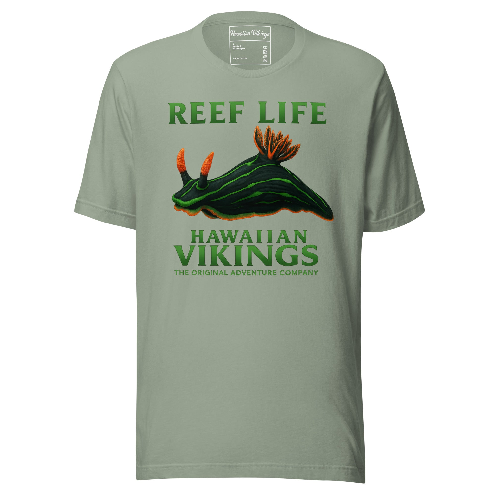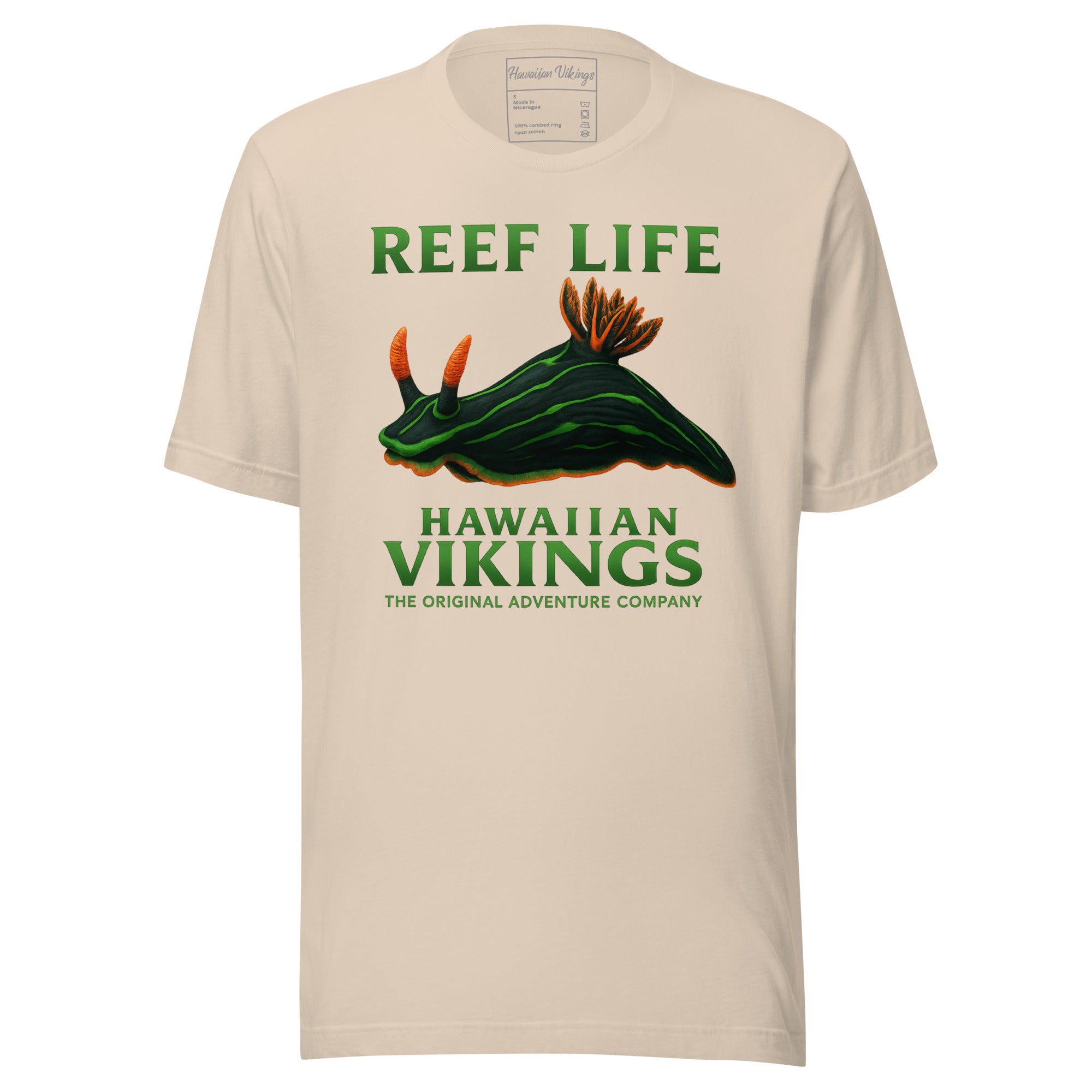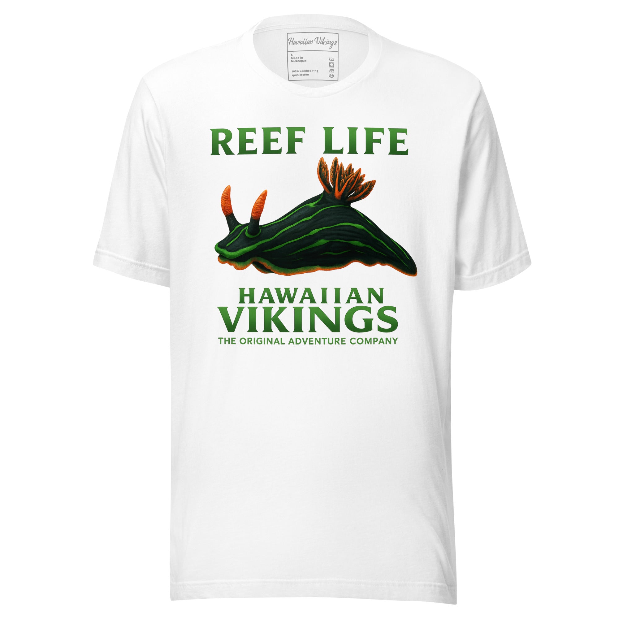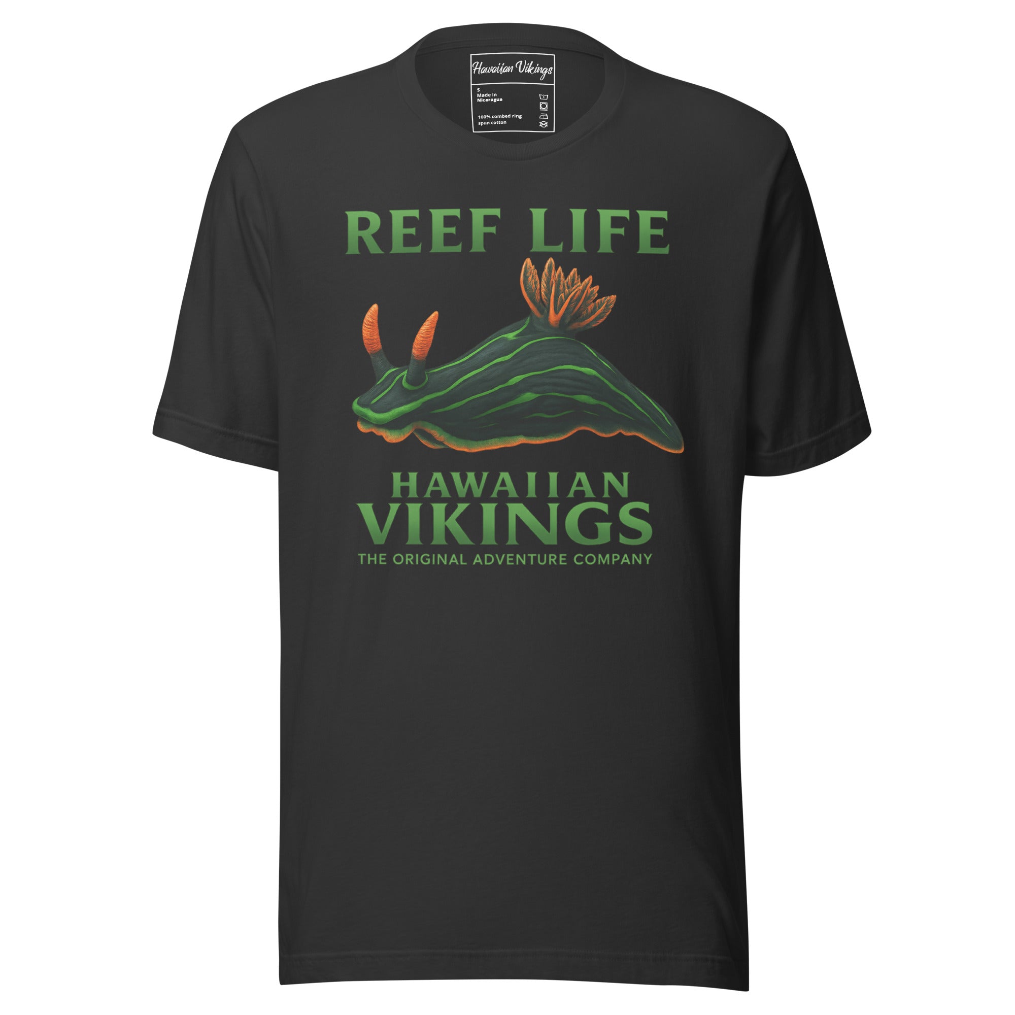 Vivid, elegant, and otherworldly — the Nembrotha kubaryana Unisex T-Shirt from Hawaiian Vikings’ Reef Life Collection celebrates one of the reef’s most stunning sea slugs, also known as the Variable Neon Slug. With its velvety black body streaked with electric green and fiery orange, this vibrant nudibranch embodies transformation, courage, and the untamed creativity of the sea. Gliding gracefully across the reef, it reminds us that beauty often lies in the boldest expressions of life.