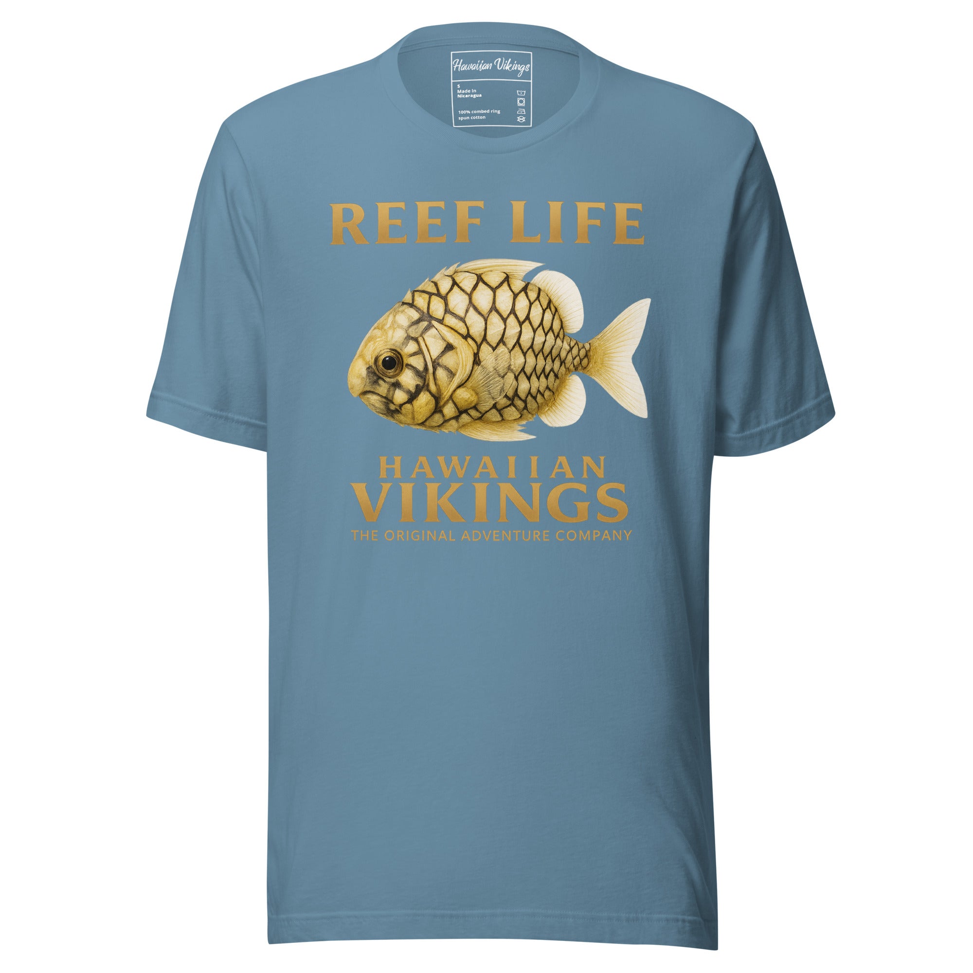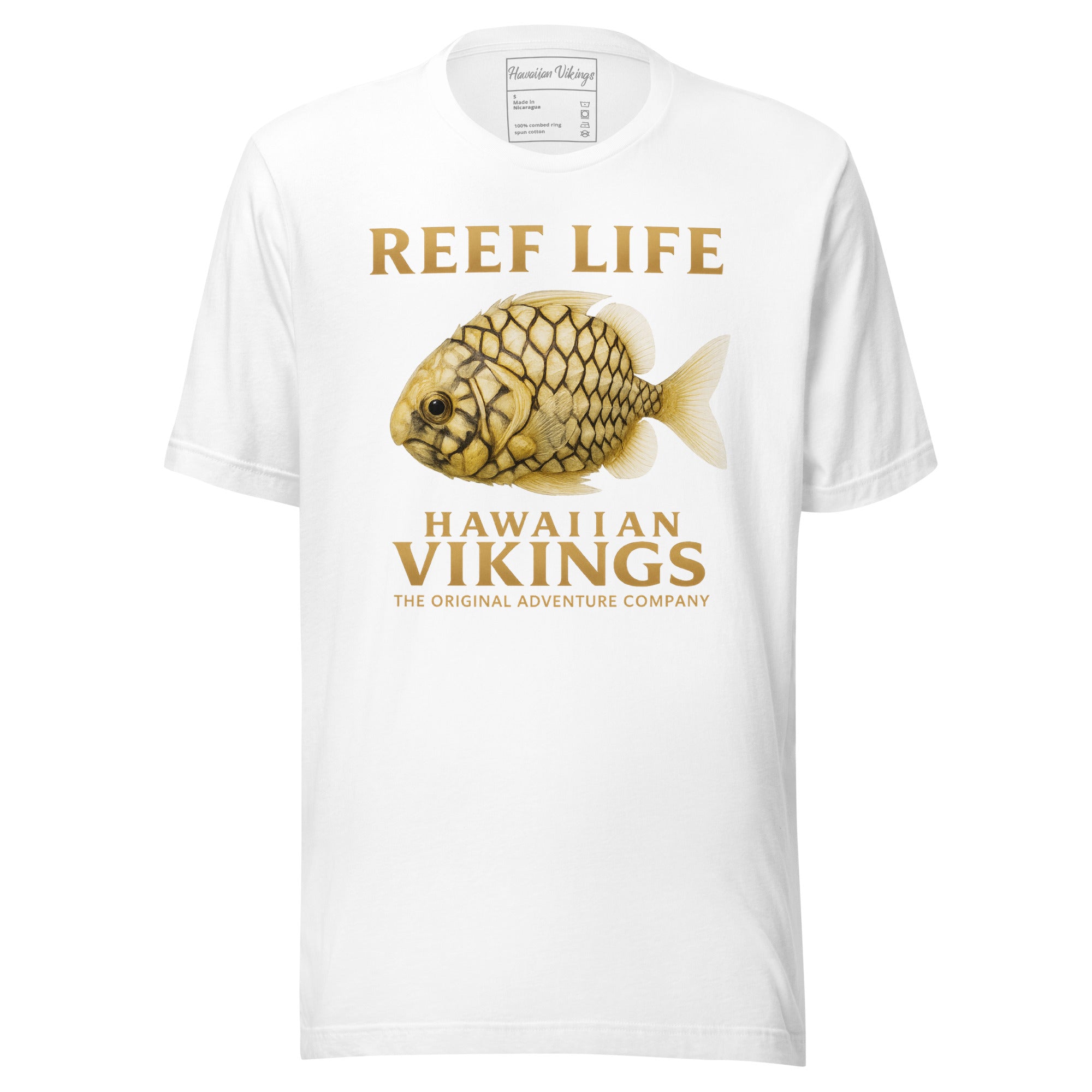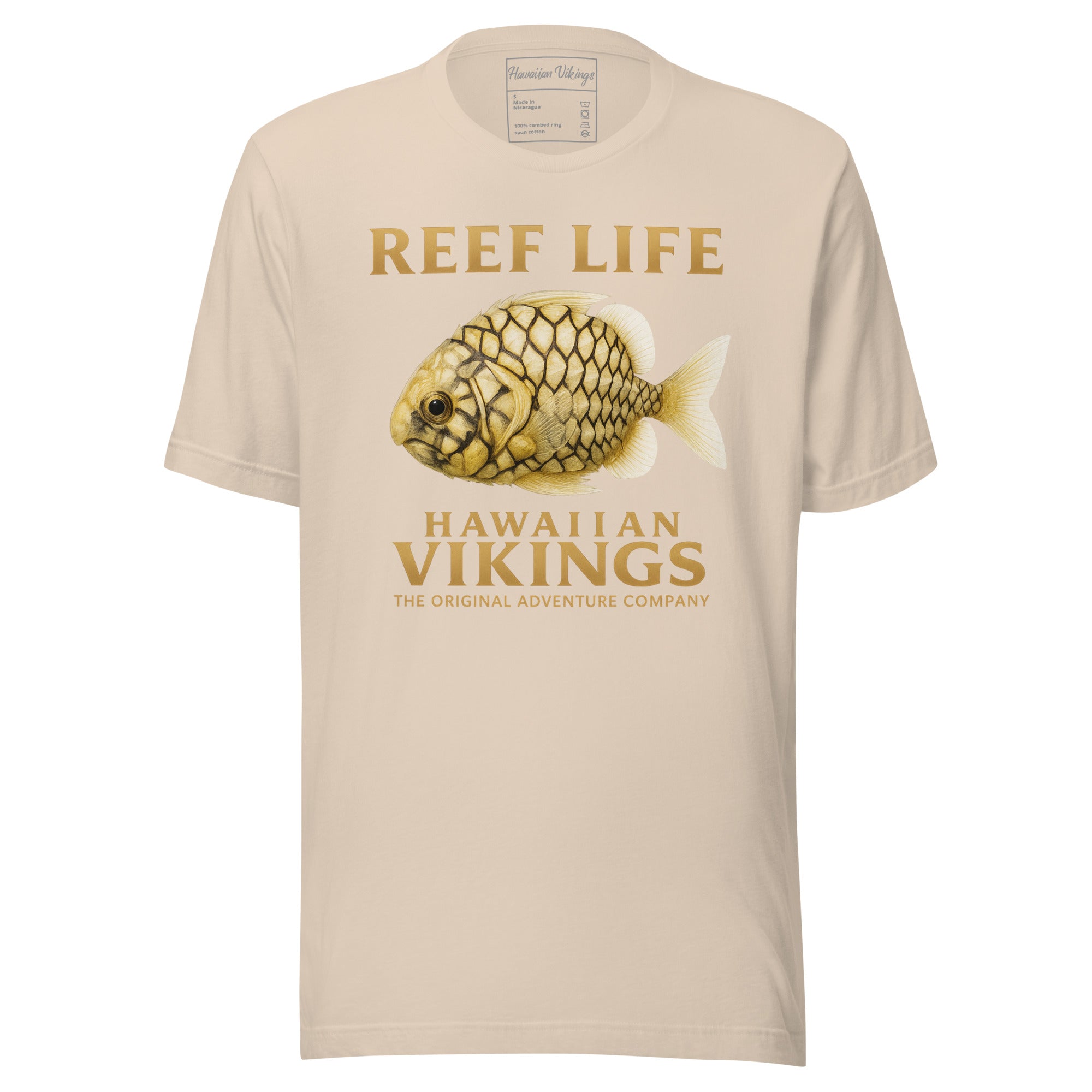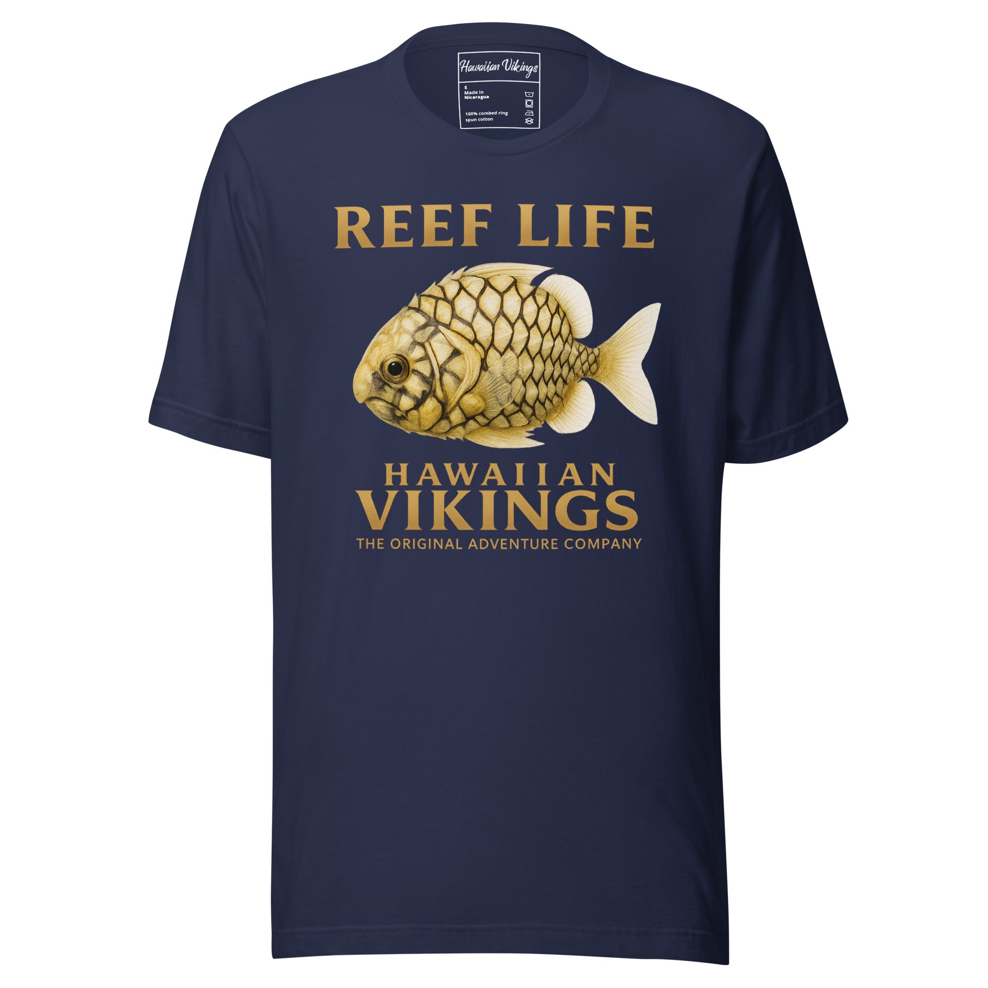 Mysterious, radiant, and ancient in spirit — the Pinecone Fish Unisex T-Shirt from Hawaiian Vikings’ Reef Life Collection honors one of the ocean’s most fascinating nocturnal wonders. With its golden armor-like scales edged in black, the Pinecone Fish embodies protection, wisdom, and the enduring strength of the deep. Glowing softly from its bioluminescent cheeks, it lights its way through dark waters — a reminder that even in shadow, life finds a way to shine.