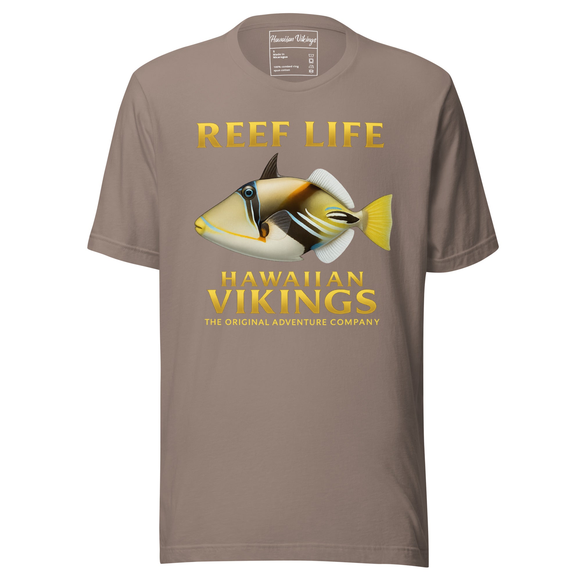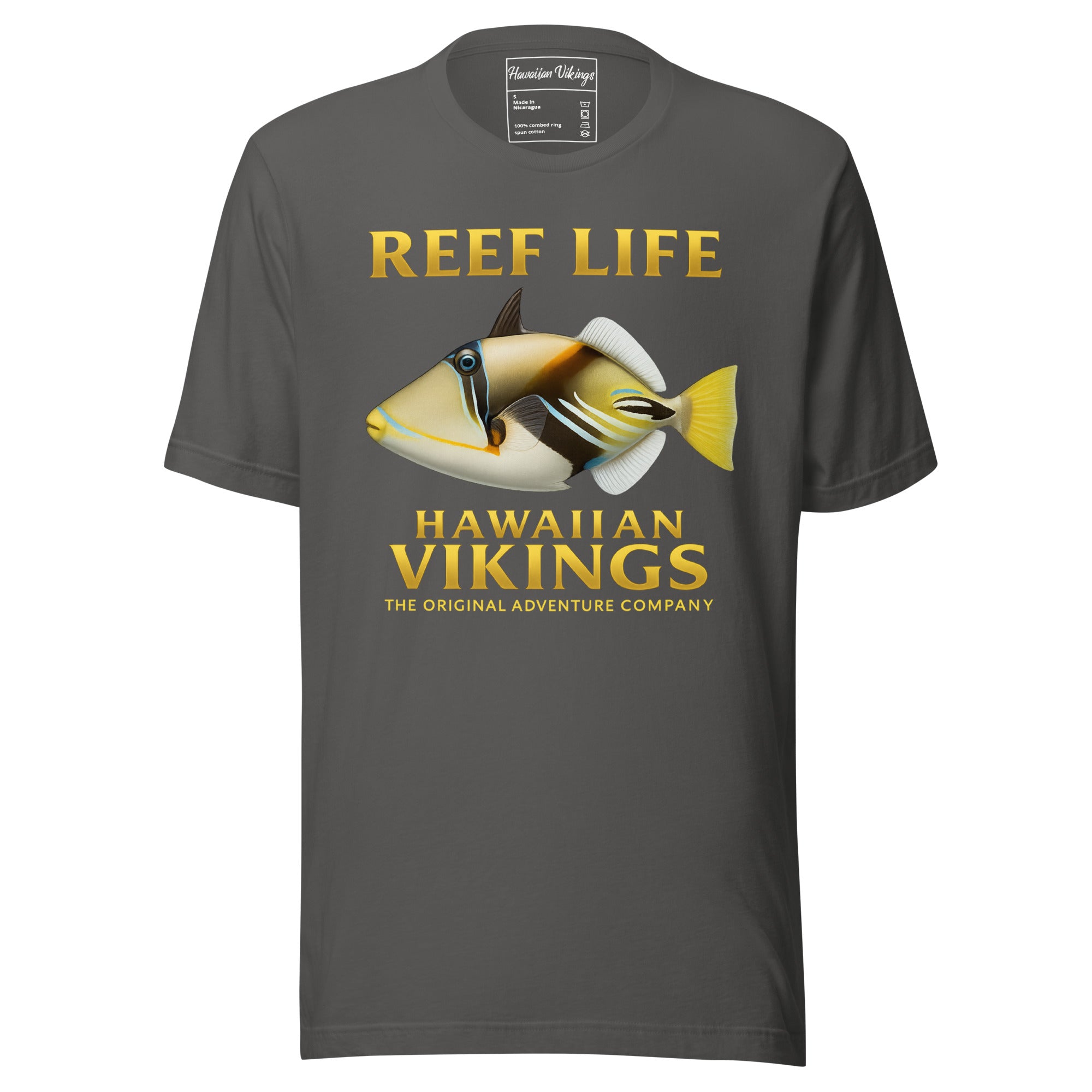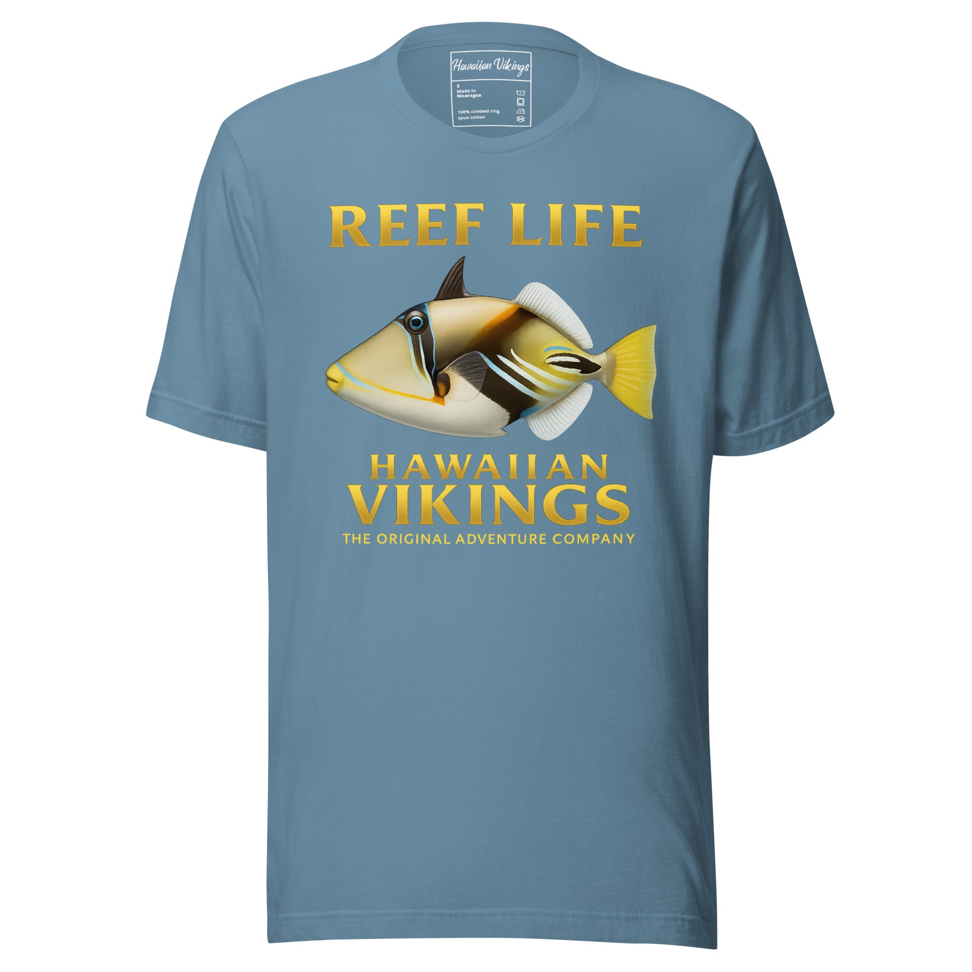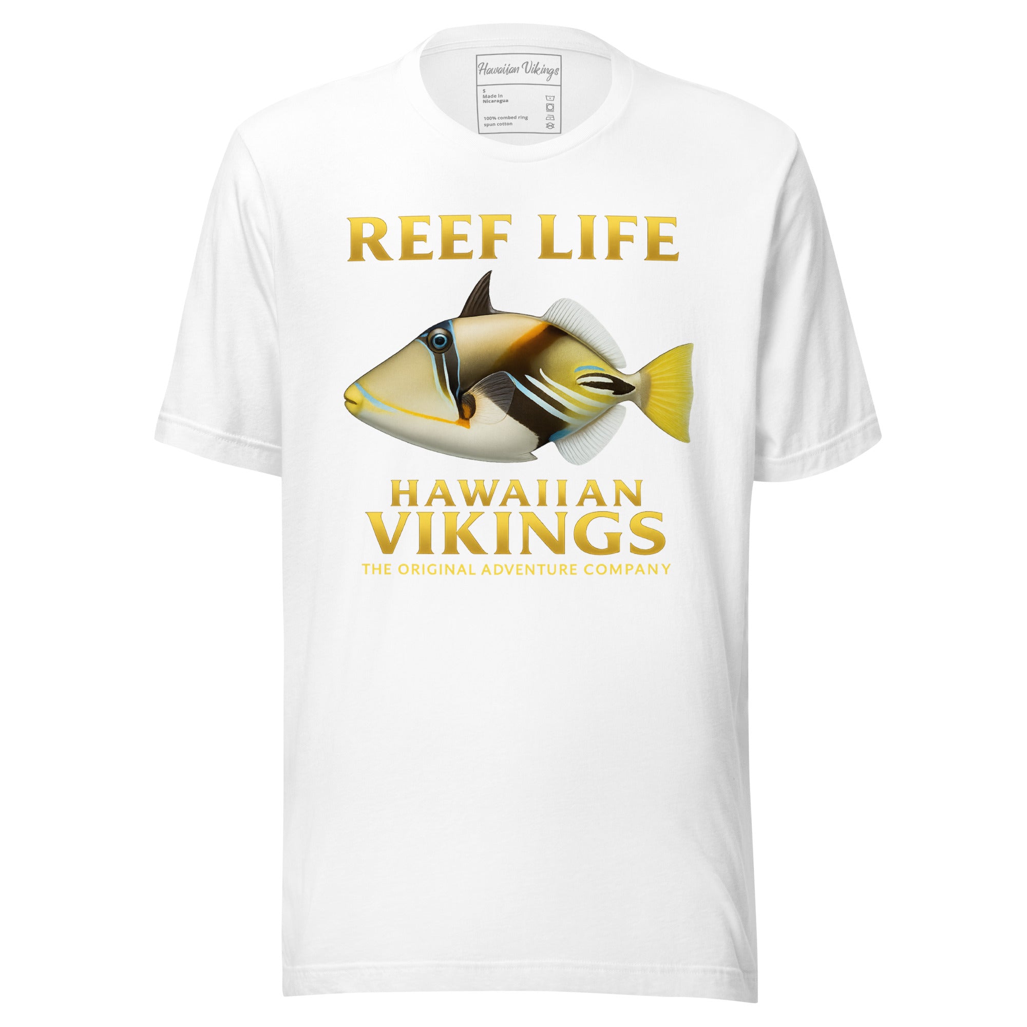 Vibrant, bold, and fiercely proud — the Reef Triggerfish Unisex T-Shirt from Hawaiian Vikings’ Reef Life Collection honors Hawaiʻi’s beloved humuhumunukunukuāpua‘a, the state fish known for its beauty and spirit. With its striking mix of turquoise, yellow, and black patterns, the Reef Triggerfish embodies courage, individuality, and the playful strength of island life. Quick, clever, and confident, this reef guardian reminds us that true aloha includes standing strong to protect the world we love.