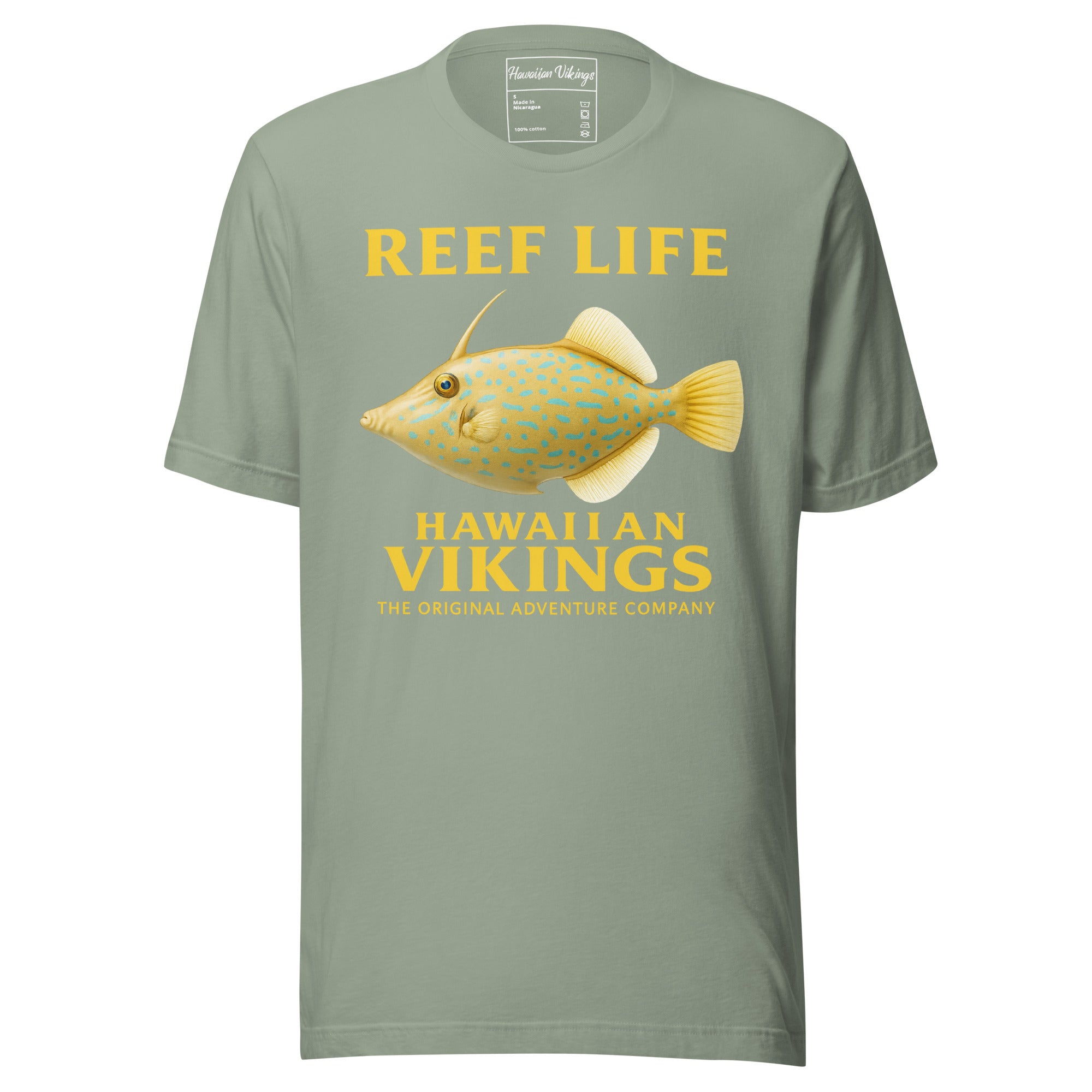 Artful, curious, and full of character — the Scrawled Filefish Unisex T-Shirt from Hawaiian Vikings’ Reef Life Collection celebrates one of the reef’s most uniquely patterned wanderers. With its pale turquoise body covered in bright blue lines and golden spots, the Scrawled Filefish embodies creativity, adaptability, and the quiet beauty of the unexpected. Gracefully drifting among corals and sea fans, this reef artist reminds us that nature’s canvas is always alive — intricate, expressive, and endlessly evolving.