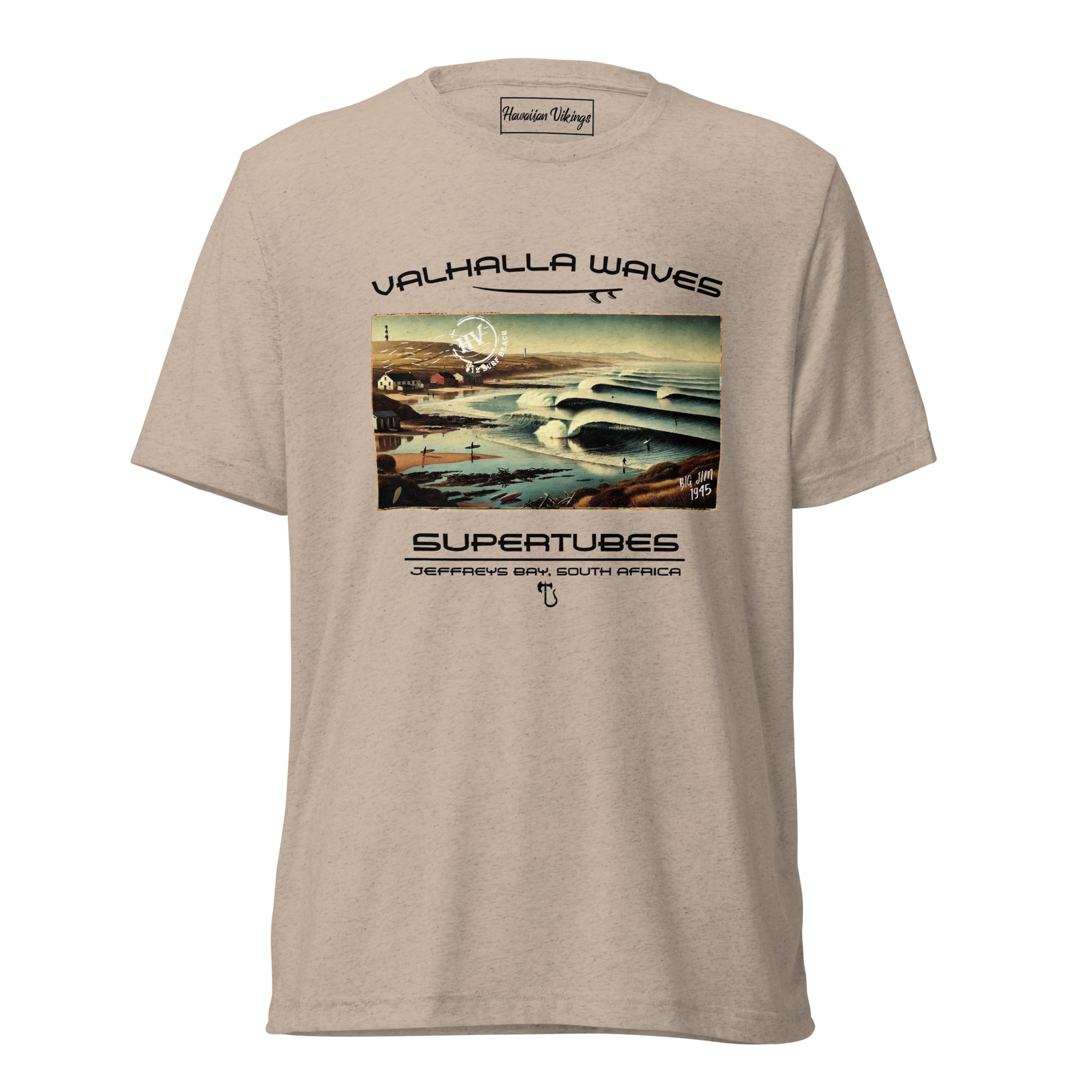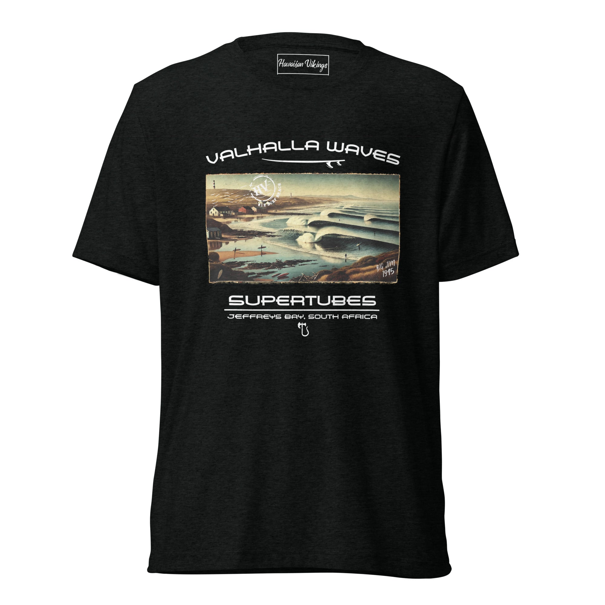 Celebrate the perfection of South Africa’s renowned right-hand point break with the "Supertubes Beach Vintage Postcard" t-shirt from the Valhalla Waves collection by Hawaiian Vikings. This design captures the essence of Supertubes, the crown jewel of Jeffreys Bay, with a retro postcard aesthetic showcasing its flawless, barreling waves. Blending Hawaiian and Viking-inspired artistry, this tee is a tribute to surfers who chase the ultimate ride on one of the world’s most famous waves. Perfect for ocean lovers and adventurers drawn to the timeless beauty and challenge of Supertubes.