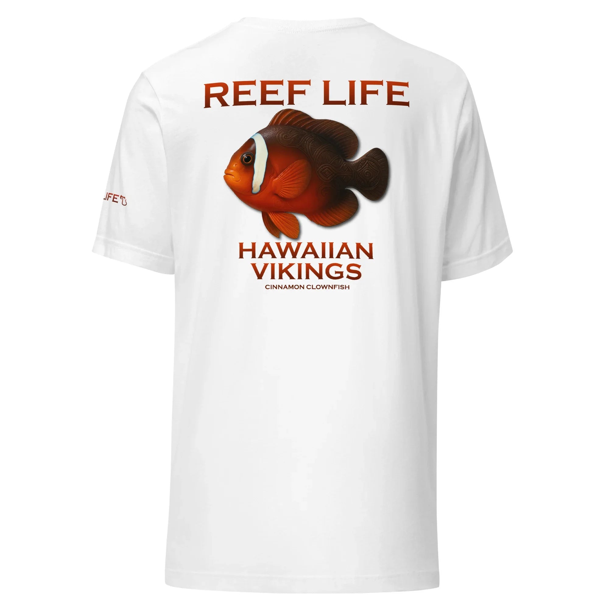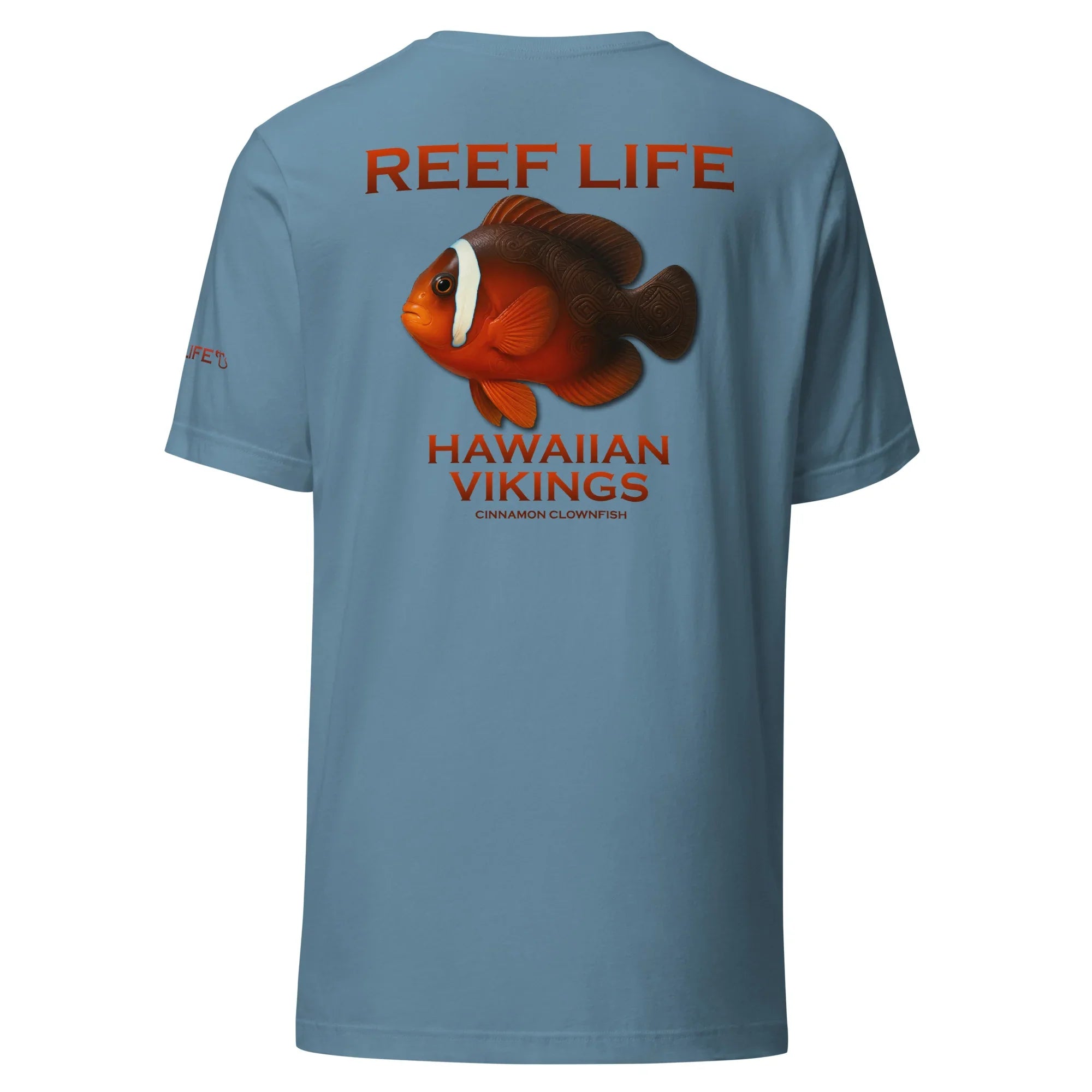 Bold and full of character, this tee from the Reef Life Collection features the striking Cinnamon Clownfish, known for its rich coloration and fearless reef presence. The design blends its natural form with engraved Hawaiian motifs and Viking-inspired carvings seamlessly woven into the artwork.
