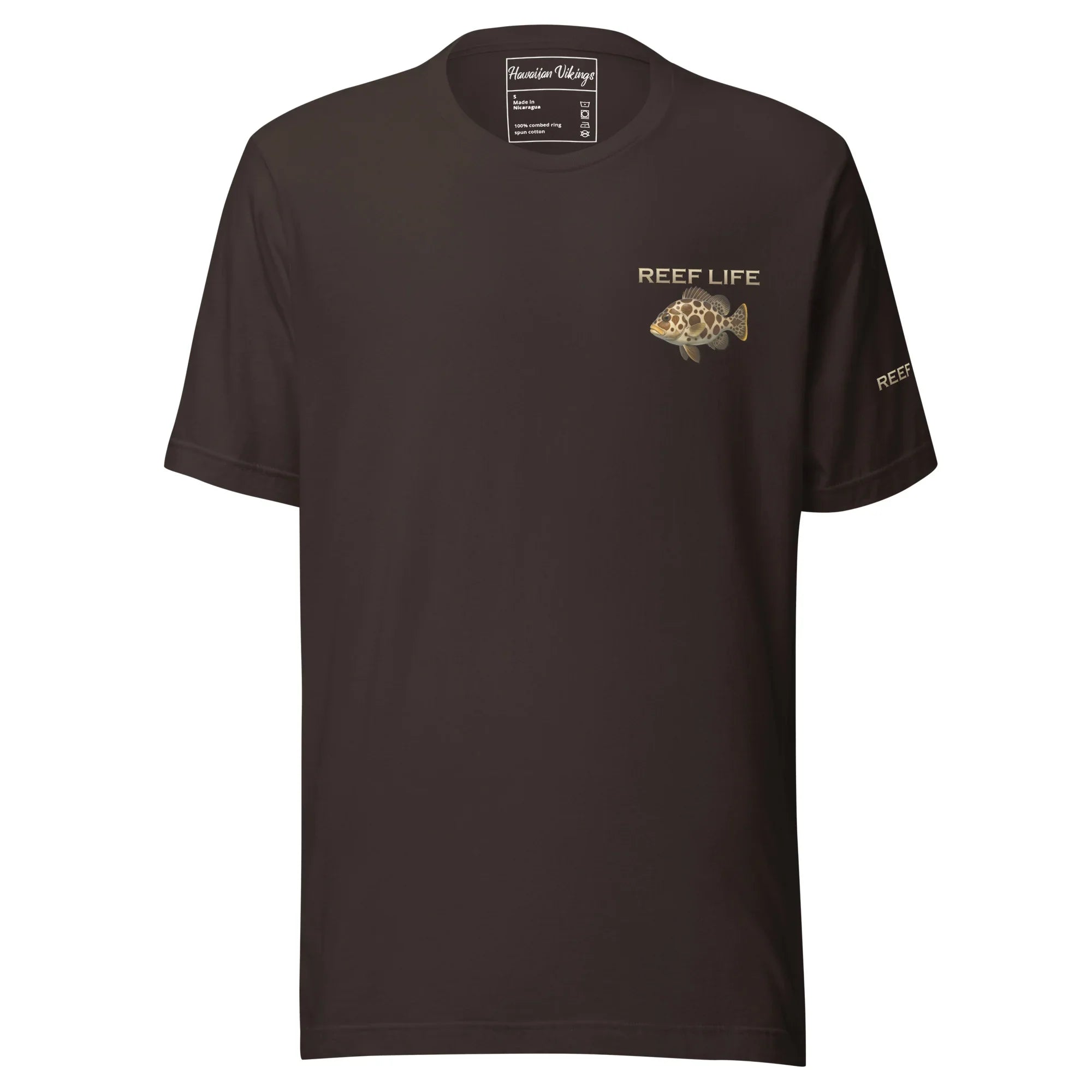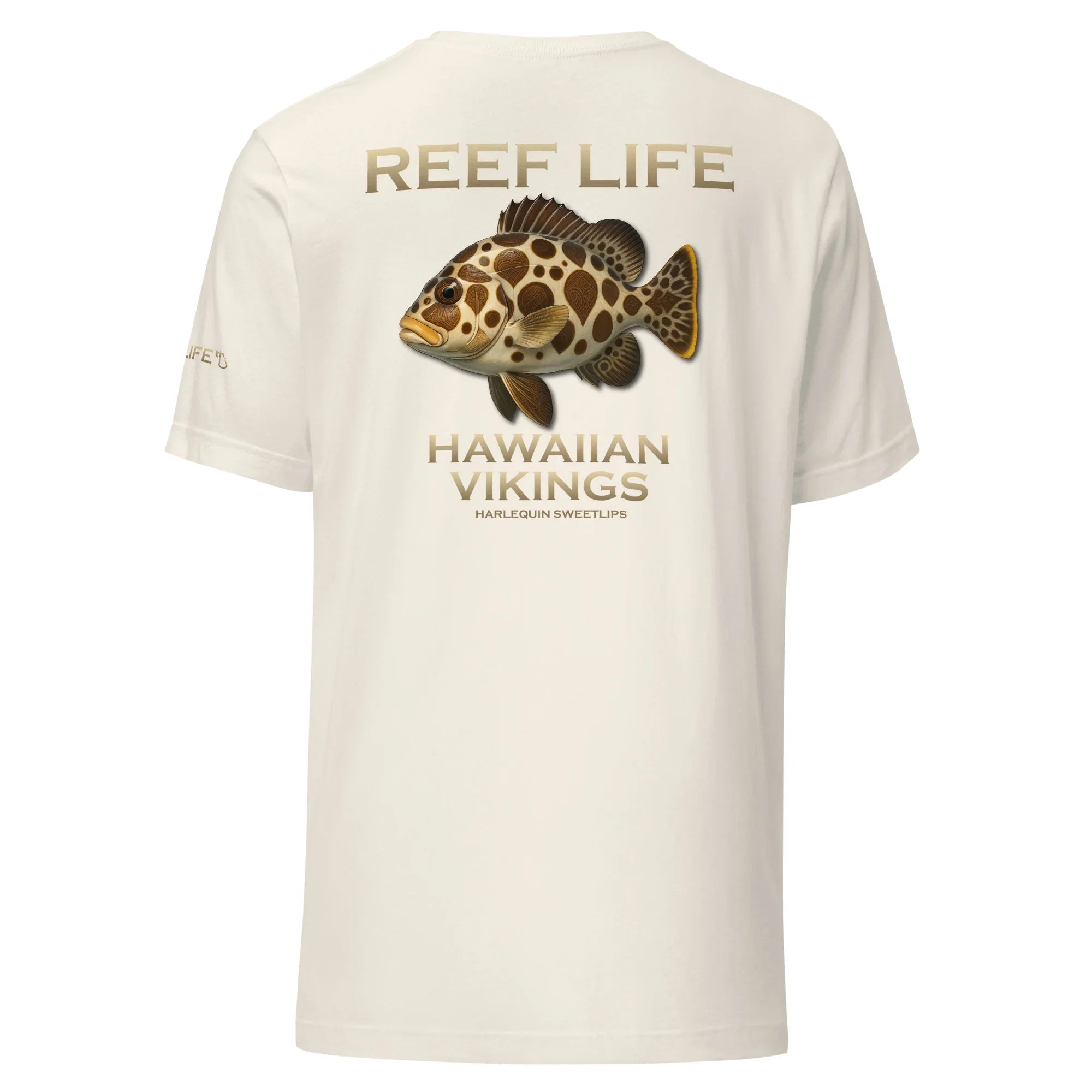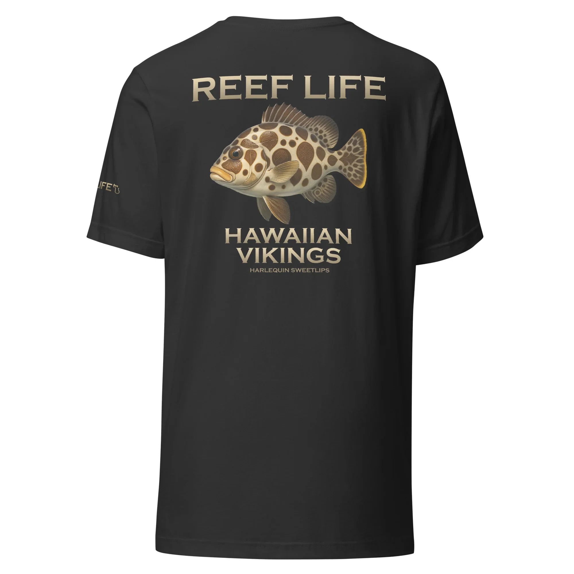 Playful and unmistakable, this tee from the Reef Life Collection features the iconic Harlequin Sweetlips, known for its bold patterns and flowing movement across the reef. The design blends its distinctive form with engraved Hawaiian motifs and Viking-inspired carvings seamlessly woven into the artwork.