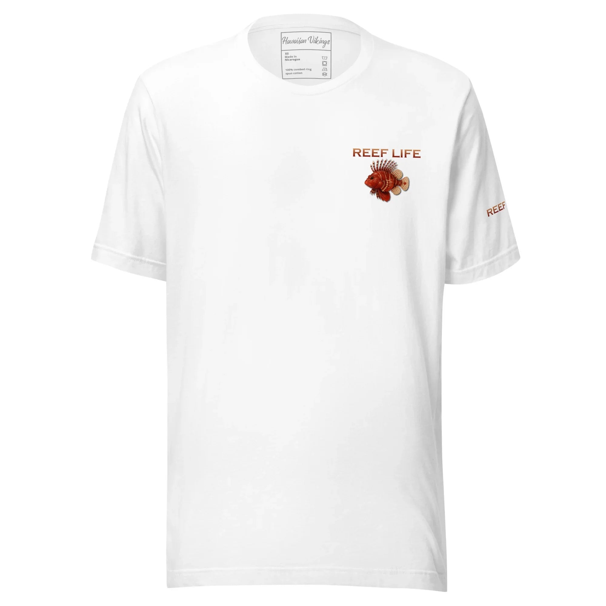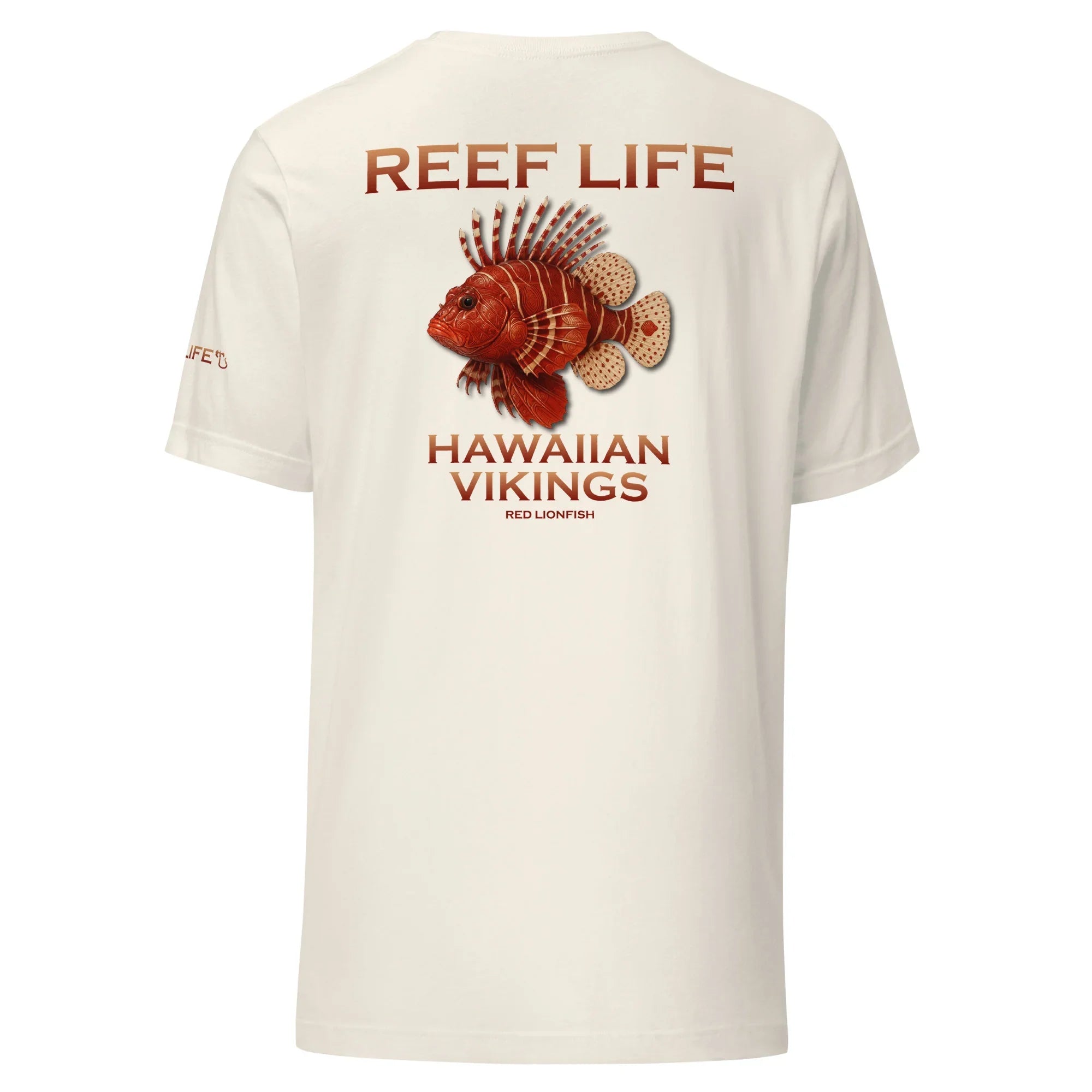 Striking and fierce, this tee from the Reef Life Collection features the bold Red Lionfish, known for its flowing spines and commanding reef presence. The design blends its dramatic form with engraved Hawaiian motifs and Viking-inspired carvings seamlessly integrated into the artwork.