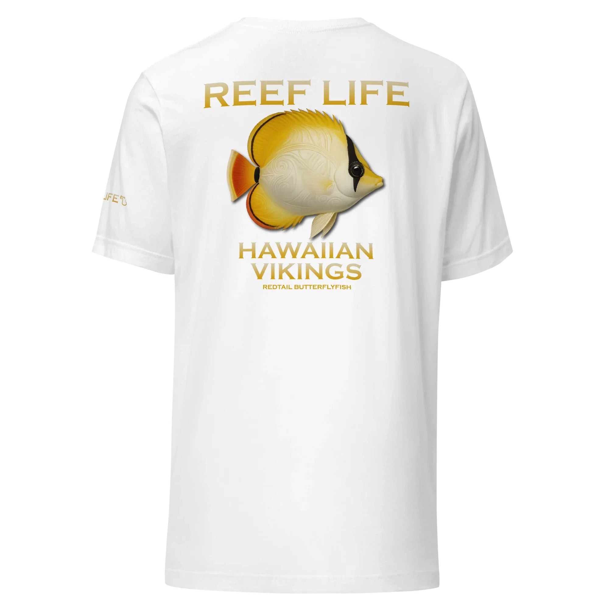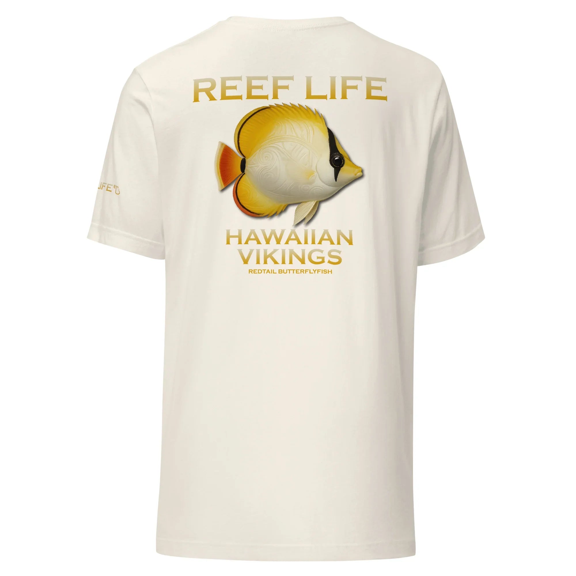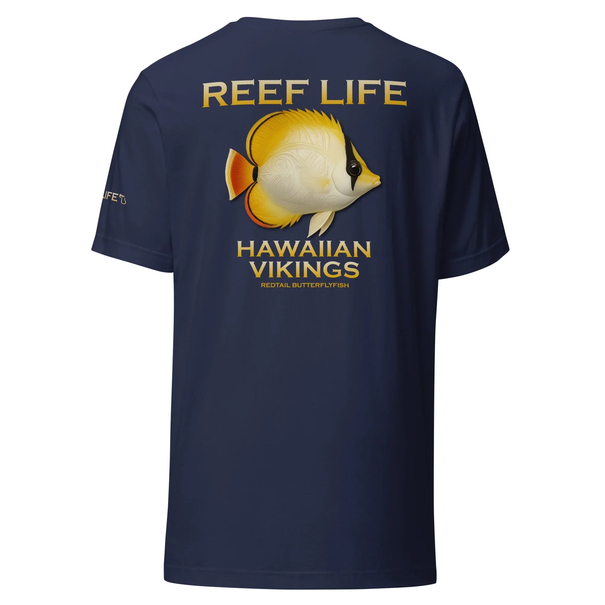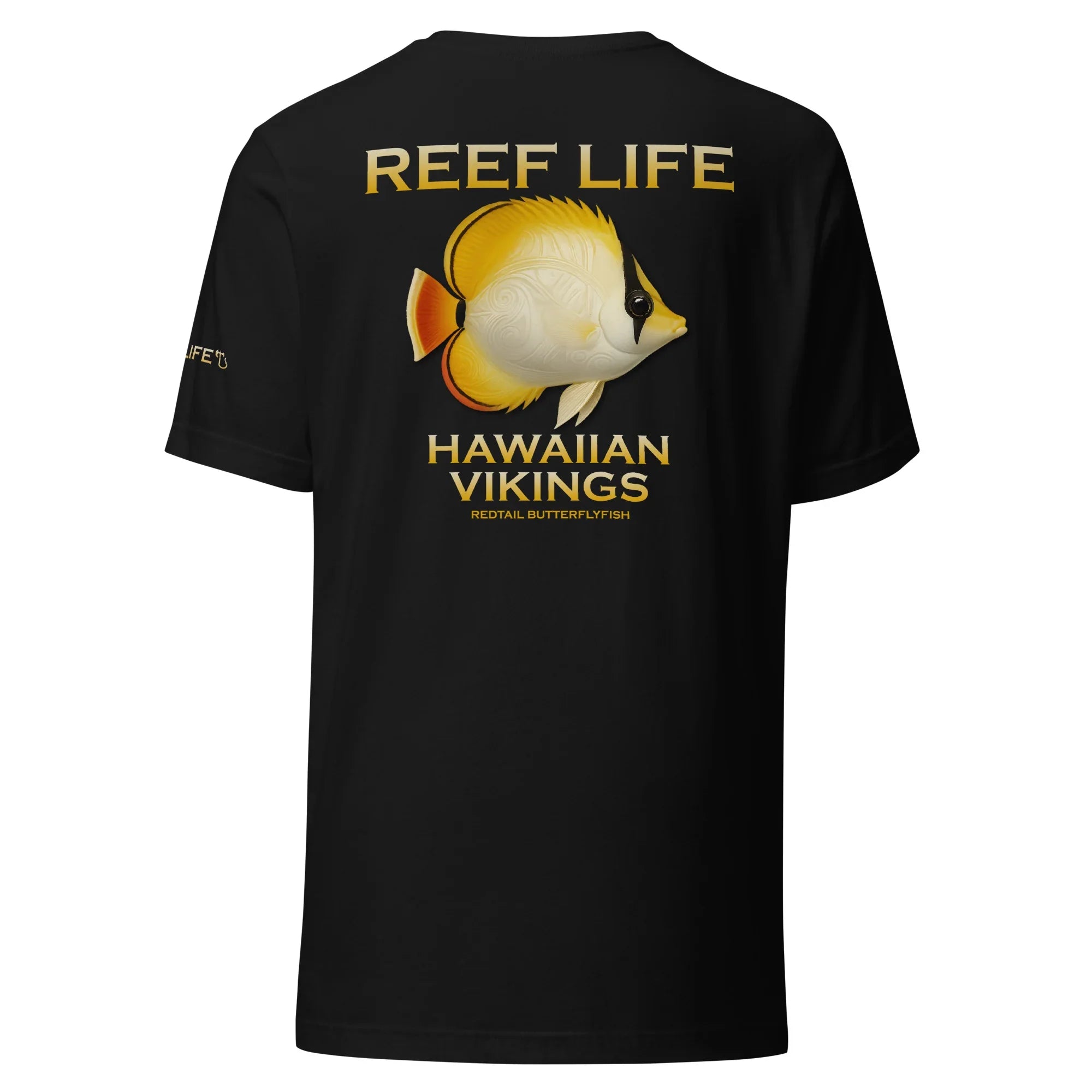 Graceful and eye-catching, this tee from the Reef Life Collection features the elegant Redtail Butterflyfish, known for its striking contrast and smooth movement through the reef. The design blends its natural beauty with engraved Hawaiian motifs and Viking-inspired carvings seamlessly integrated into the artwork.