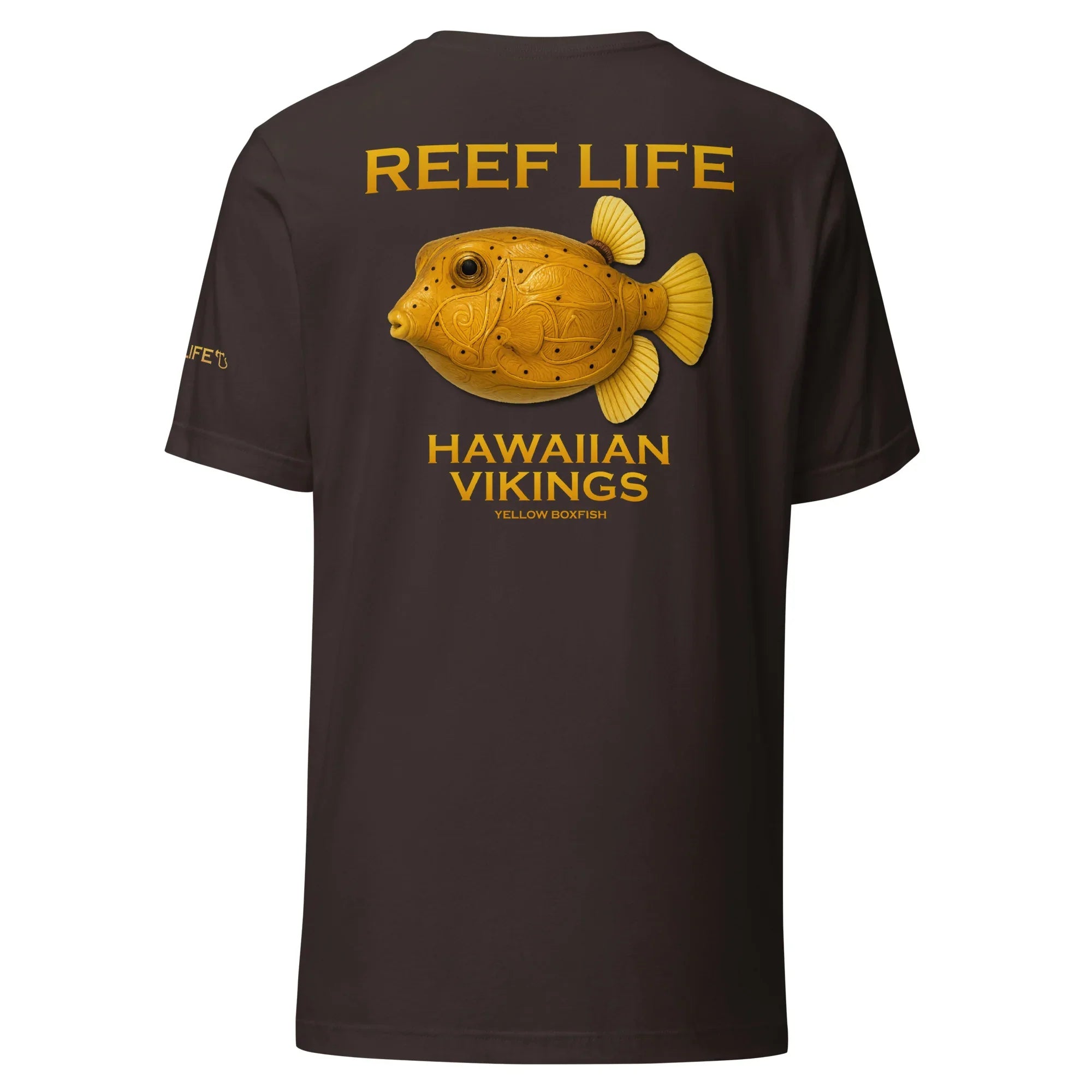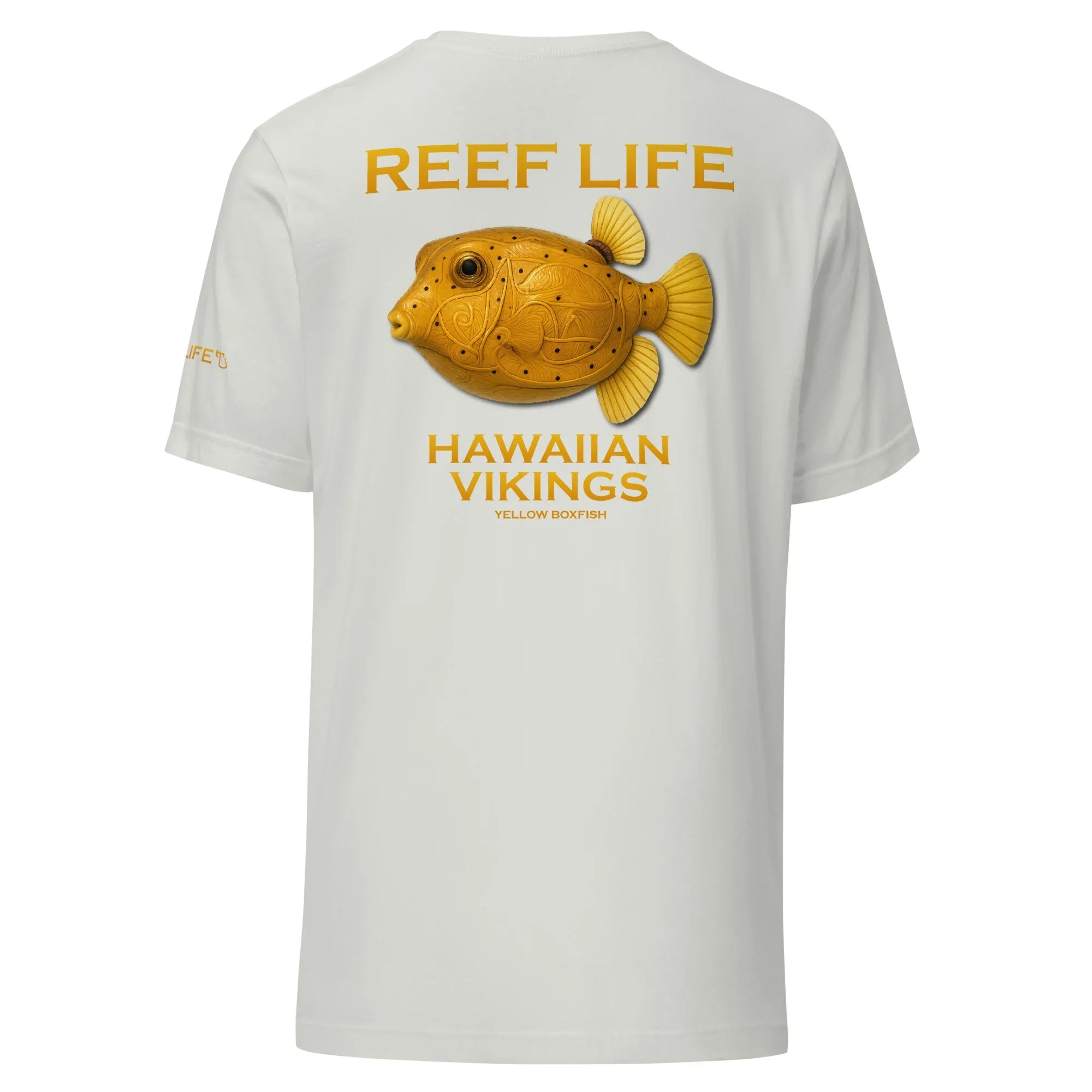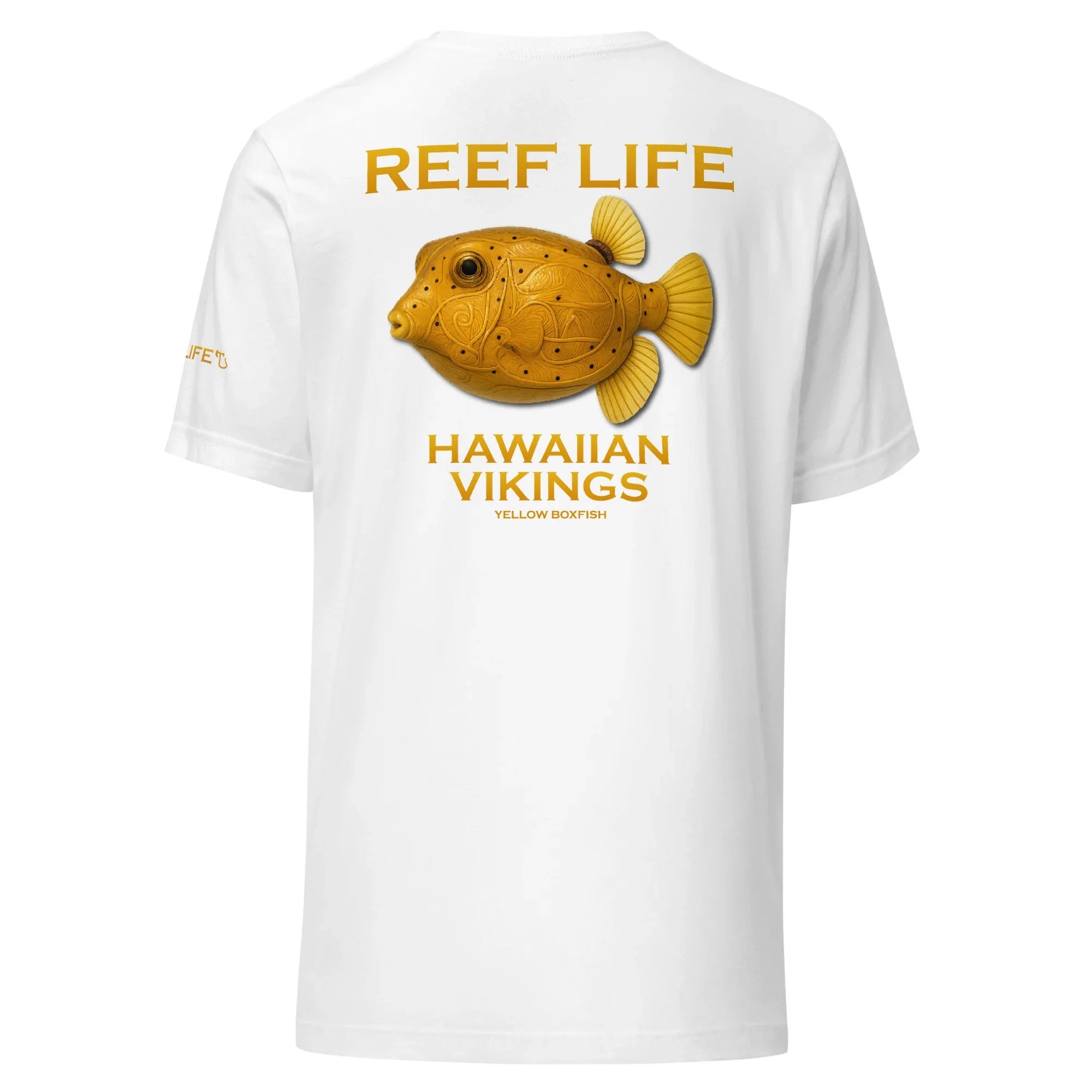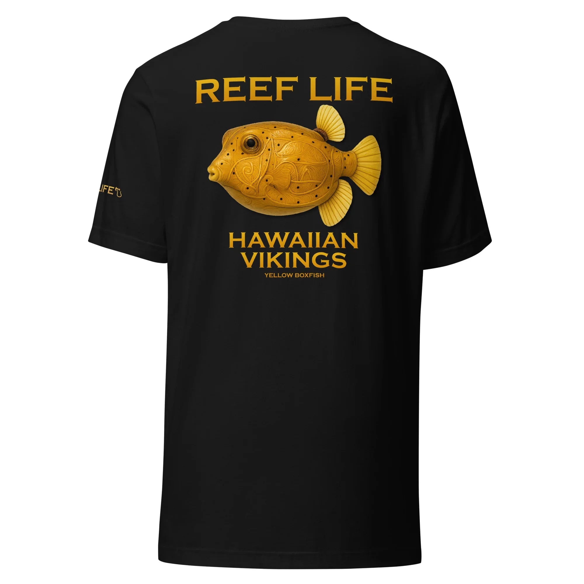 Bright, bold, and full of character, this standout tee from the Reef Life Collection features the iconic Yellow Boxfish, known for its vibrant color, playful presence, and unmistakable reef charm. The design highlights its golden hues while seamlessly integrating engraved Hawaiian motifs and Viking-inspired carvings into its natural form.