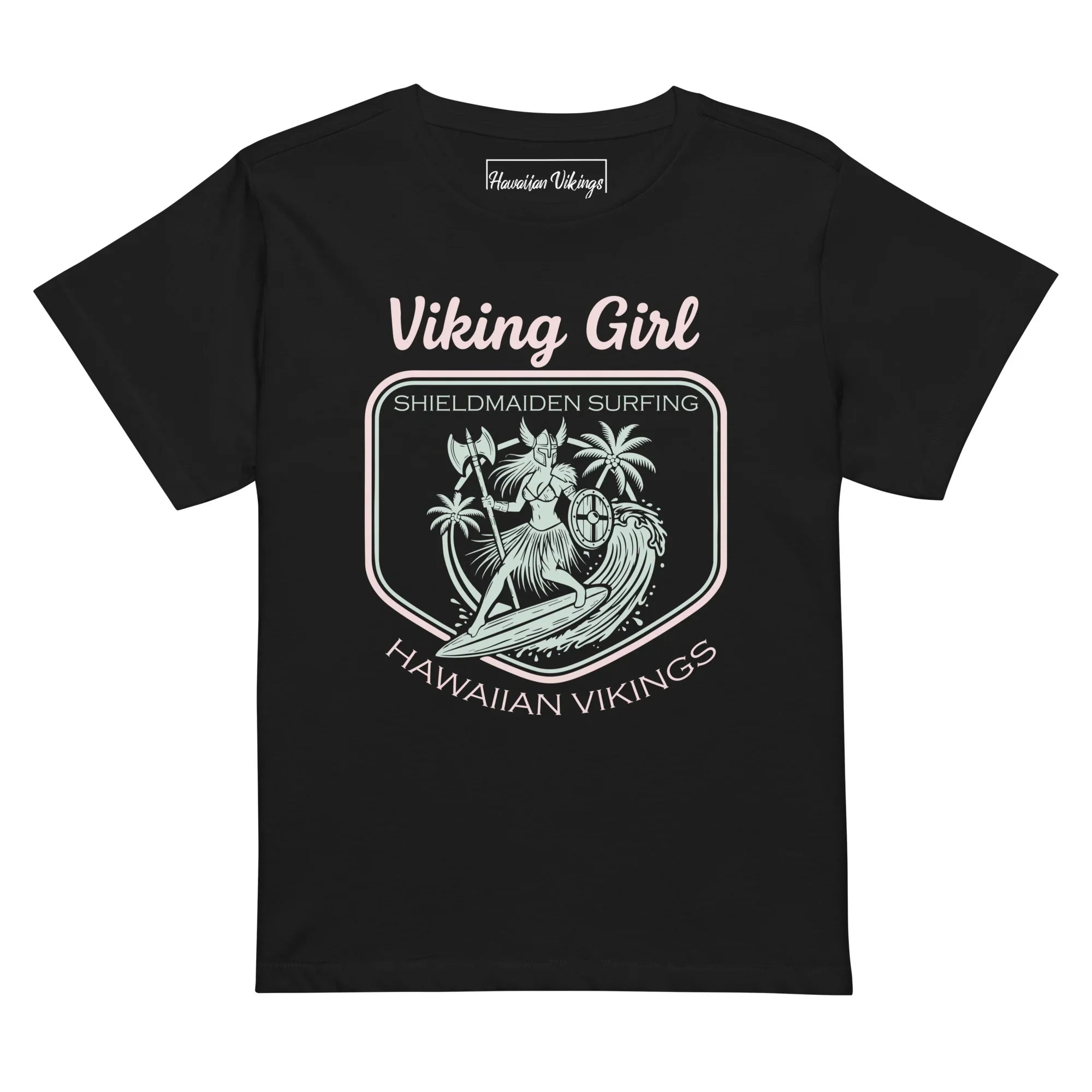 Bold, graceful, and unapologetically fierce, the Viking Girl Women’s High-Waisted Tee redefines strength with island soul. This pastel tropical design features a powerful shieldmaiden surfing through sun-washed waves, blending warrior spirit with coastal beauty. Finished with the bold tagline “Shieldmaiden,” this tee celebrates women who lead with courage, balance, and confidence.